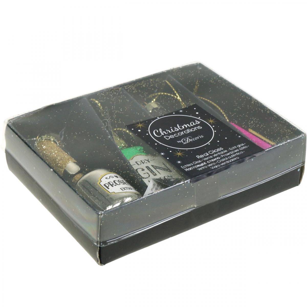 Add a touch of extravagance to your Christmas decorations with these high-quality Christmas ornaments made from real glass. The Christmas tree decoration comes in the form of four small shiny spirits bottles: Prosecco in silver, gin in green, whiskey in orange and red wine in purple. The bottle necks are decorated with sparkling glitter dust for that little something extra. An eyelet and a golden cord serve as a practical suspension.