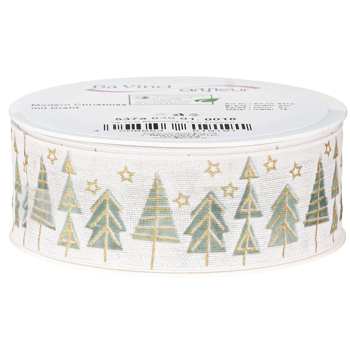 This white Christmas ribbon with a modern pattern of fir trees and stars in green and gold will add a truly festive touch to your winter decor! It's also a true winter wonderland as a gift ribbon.The turquoise-green fir trees, golden details, and stars on the white, slightly translucent background are reminiscent of a wintry landscape and are a perfect match for frosty winter decor. Use this ribbon to add an atmospheric and subtly glamorous touch to your Advent wreaths, door wreaths, and other decorations.
