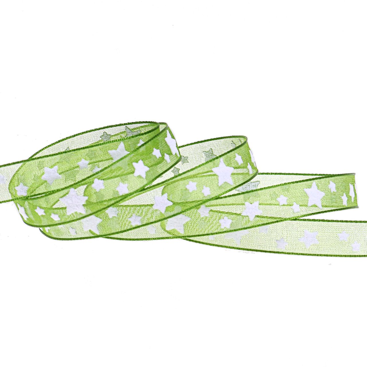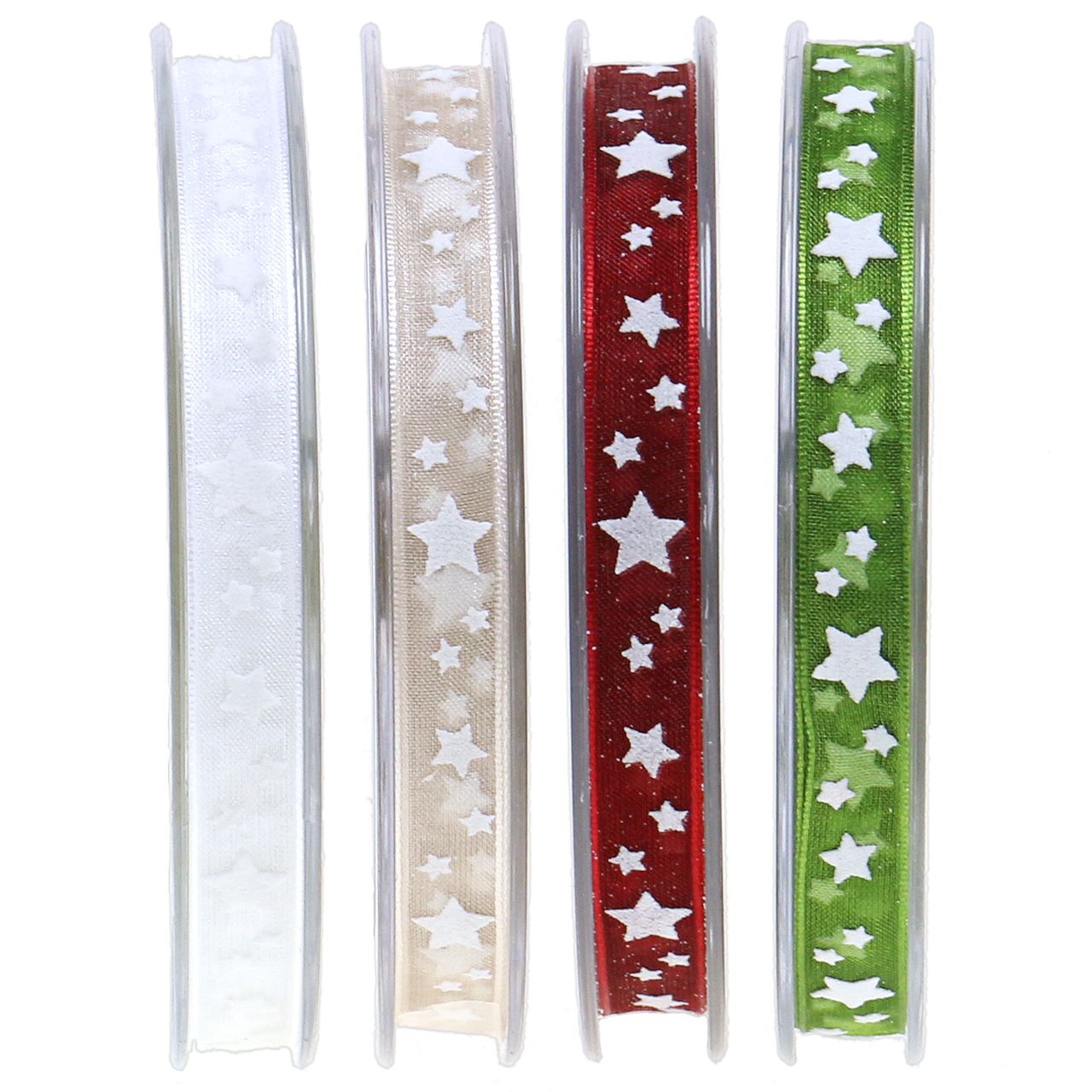 The Christmas ribbon with star decoration made of organza is wound on a plastic spool with a hole for hanging it up. It has a width of about 10 millimeters and a total length of about 20 meters.