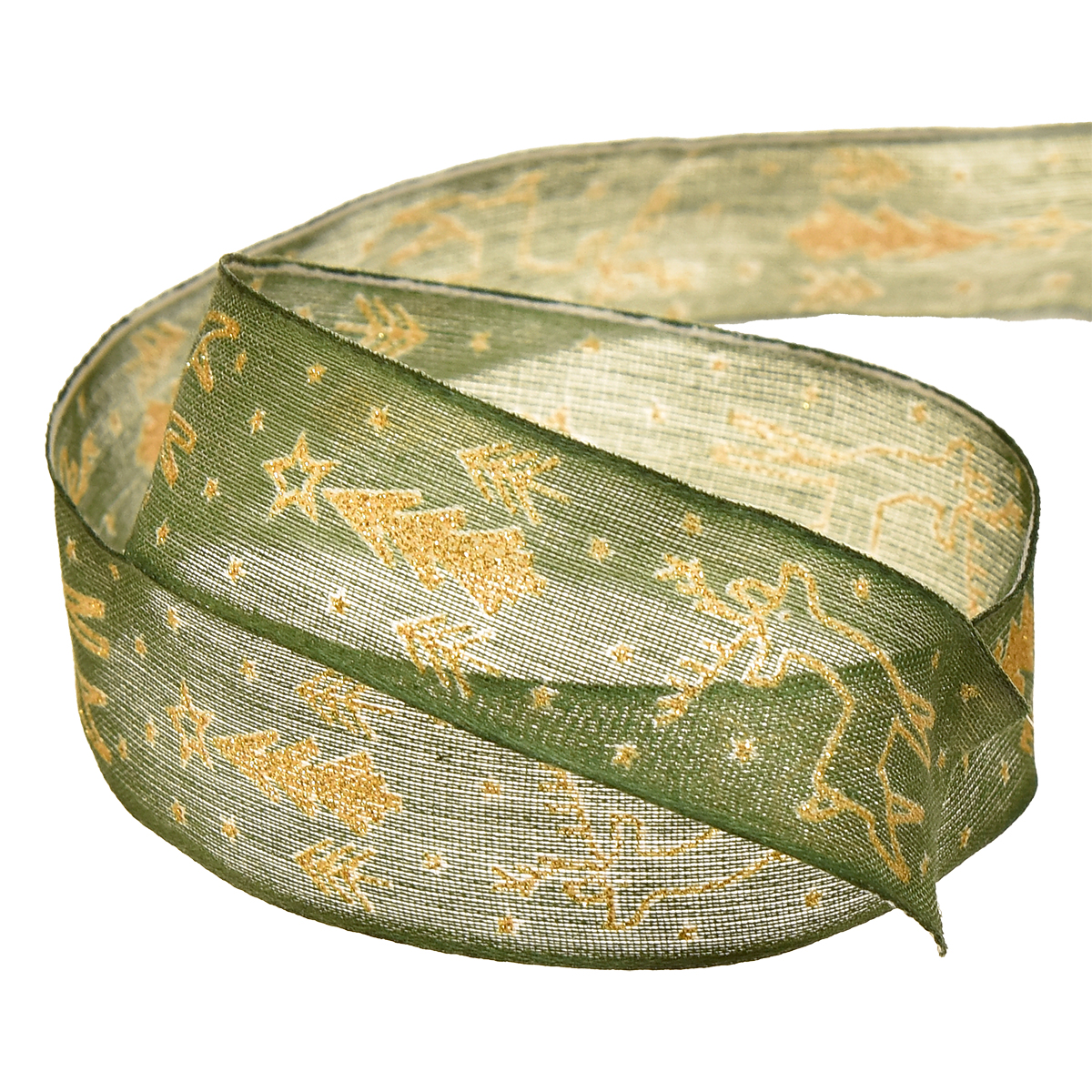 Christmas ribbon wire edge reindeer green gold W25mm L18m