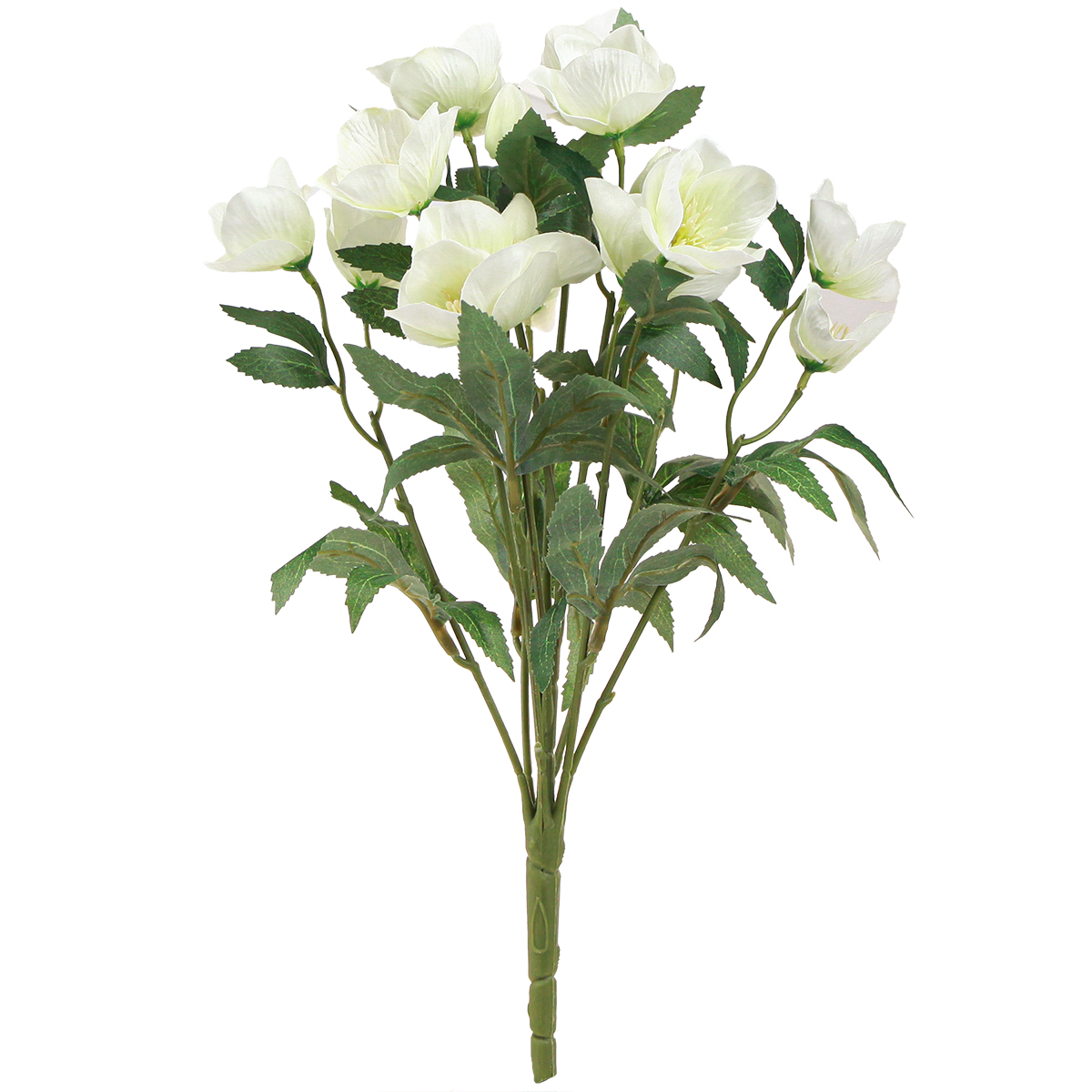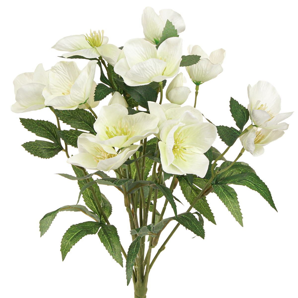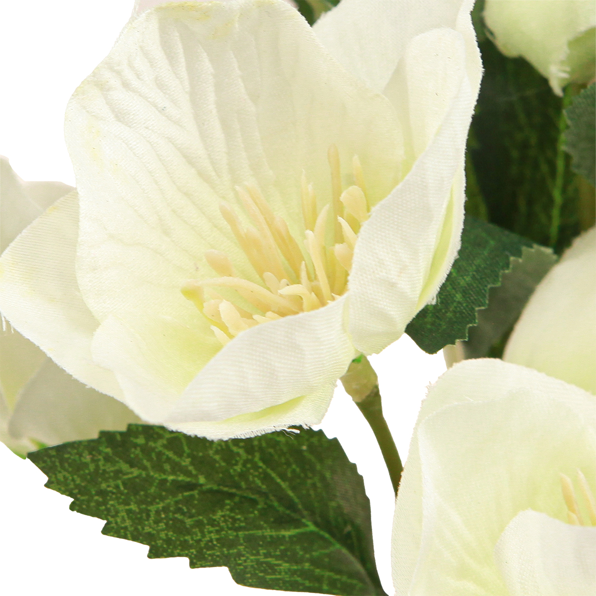 Decorate your home at Christmas time with this artificial Christmas rose bouquet in cream! The pretty artificial flower consists of a main stem from which several smaller stems with flowers protrude. These are faithfully modeled on the real Christmas rose, which is also known as the snow rose, Christmas rose, black hellebore and Helleborus niger and radiate a fascinating atmosphere with their light cream color.Thanks to the wide stem, you can put the artificial plant in a pretty ceramic vase, for example, and then place it on a living room table, a chest of drawers or a window ledge. Feel free to add a Christmas ribbon and a flower stud or just cleverly hang a small Christmas ball and a chain of lights on the decorative flower and create an extraordinary and contemporary Christmas decoration! You can also use the artificial rose with other artificial flowers to create a large flower arrangement.