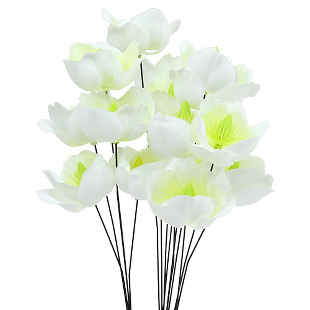 The artificial Christmas rose on a wire in white is delivered in a bundle with a total of 50 pieces. The flower head has a diameter of about 6 centimeters and the entire artificial flower, including the wire, is about 32 centimeters long.