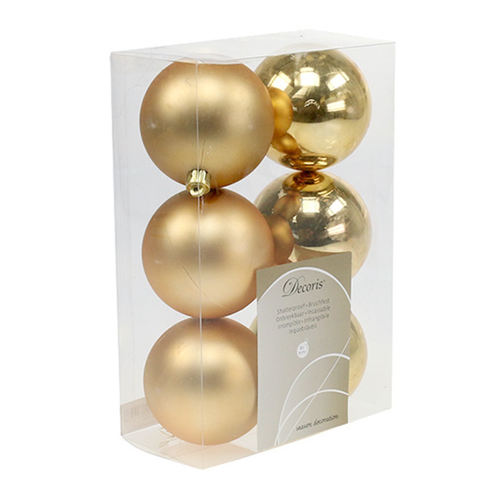 The Christmas tree balls made of gold-colored plastic come to you in a box with a total of 6 pieces and including the hangers. Each ball is approximately 9 centimeters in diameter with a diameter of approximately 8 centimeters.