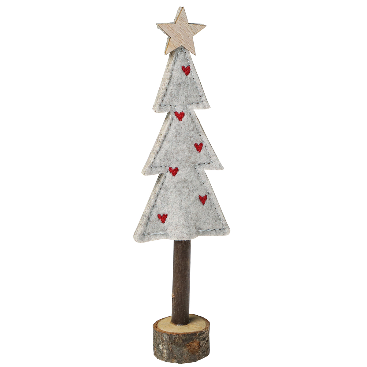 The mini Christmas trees, which are around 21cm high, are available in two versions: with red stars and with red hearts. The trunk and base of the tree are made of real wood with bark, which gives each piece an individual and natural touch. The combination of soft felt and warm wooden elements creates a cozy atmosphere and goes wonderfully with a country house style or a modern Scandi interior.