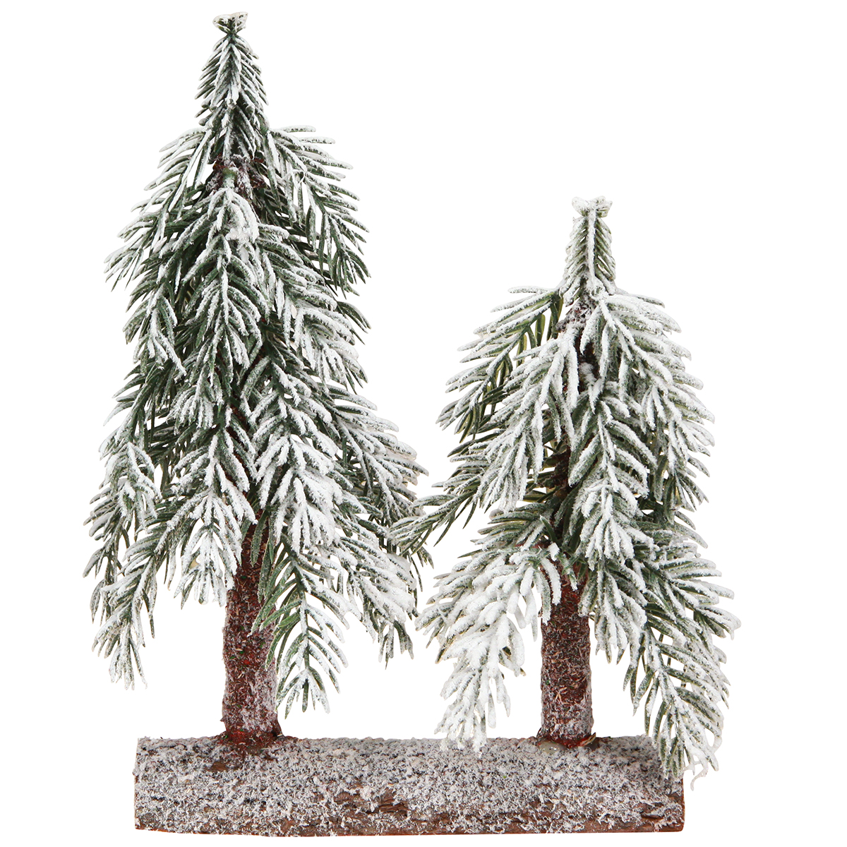 2 small snow-covered fir trees on a wooden base: a must-have for your winter decoration