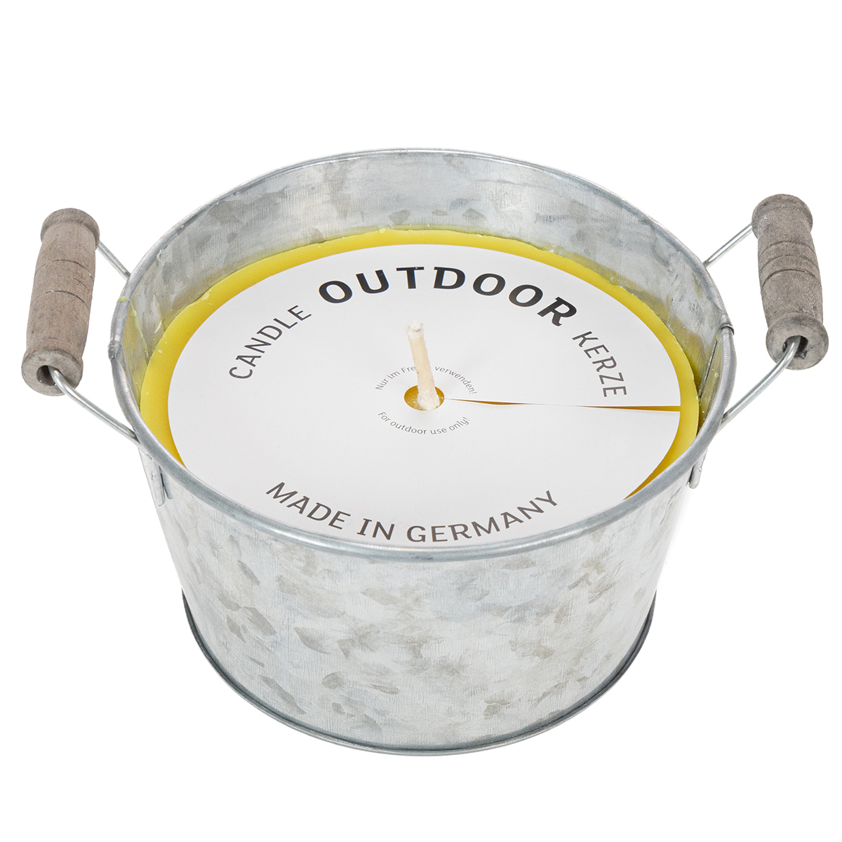 Why let insects bother you at your outdoor party when you can enjoy it so much more peacefully? This large citronella candle perfectly combines functionality and design. The sturdy zinc bucket with its wooden handle complements any outdoor setting, whether it's a modern balcony or a rustic country garden party. Thanks to the natural citronella fragrance, you can enjoy long summer nights protected by the effective insect-repellent candle in the bucket.