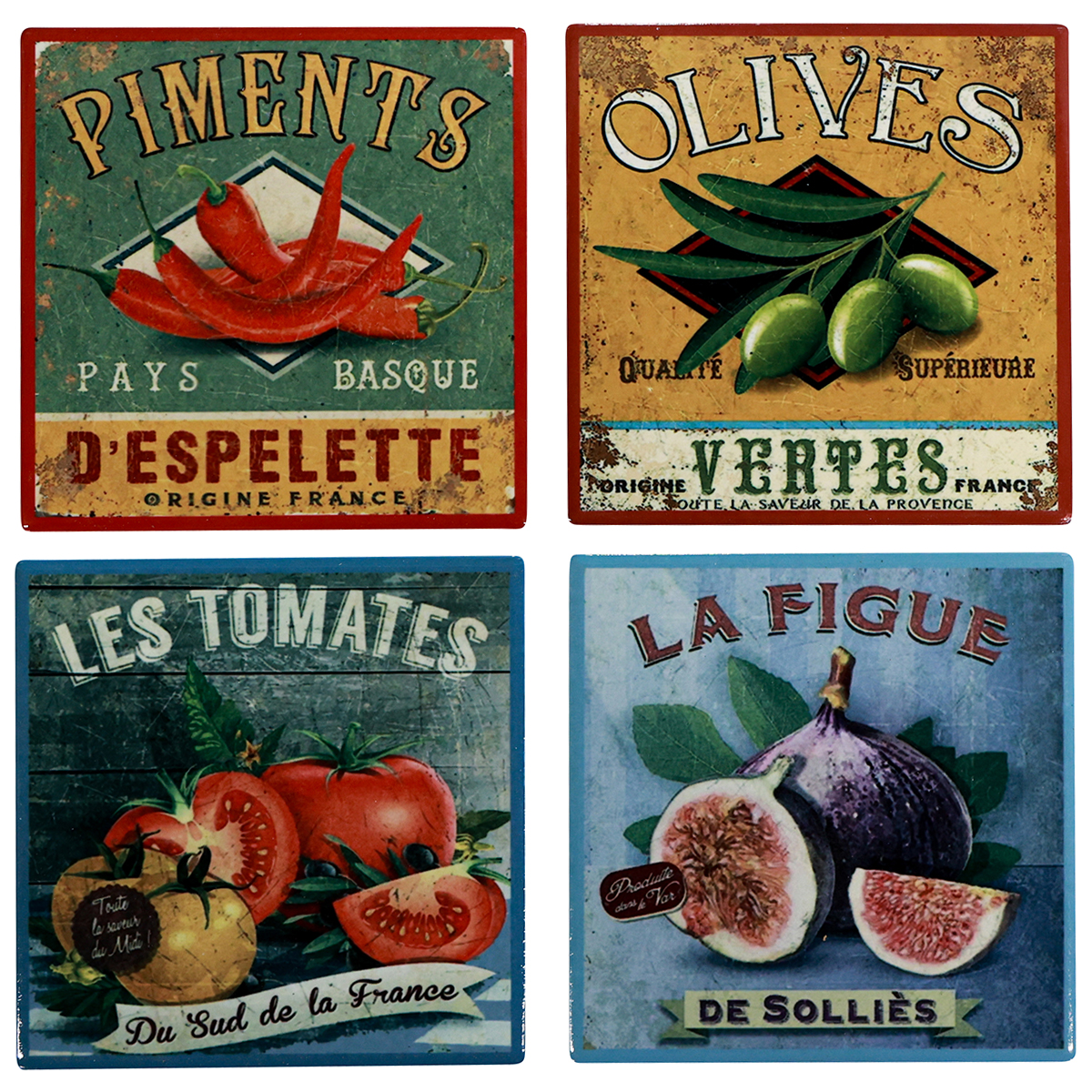 A cut fig stands in the foreground, while a closed one sits behind it. The other shows a few pimentos in bright red. Olives can be found on the third and on the fourth you can see tomatoes of different colors. Idyllic kitchen decoration in a vintage design – but also chic in the living room!