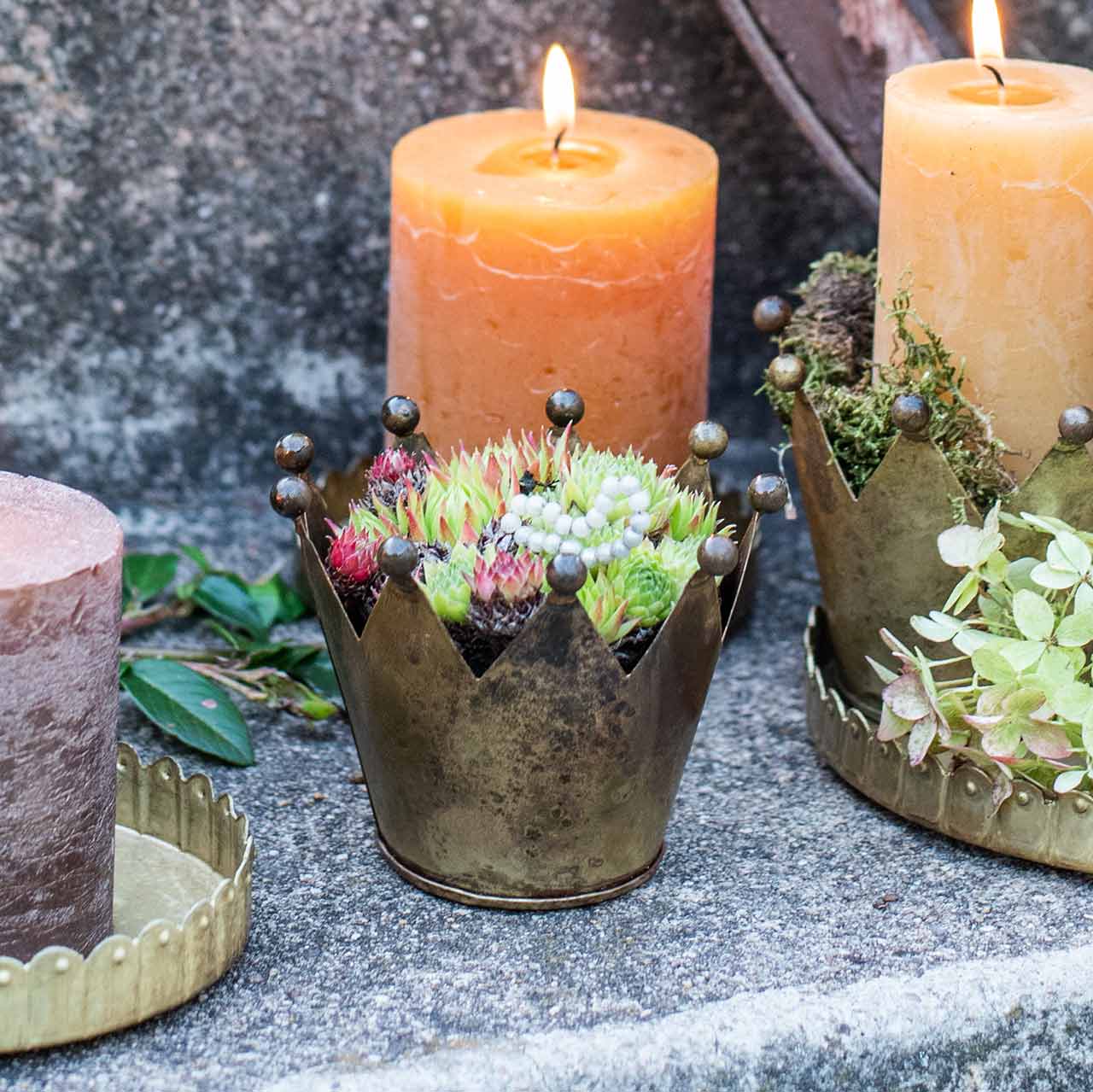 Therefore, the small metal decoration fits perfectly into the Christmas decoration or your brass candle holders. Put a tealight in the crown in gold or use the decorative crown as a small planter, for example for succulents. An LED tealight or a mini arrangement also looks enchanting in the brass crown. For a small decoration before Christmas, with foil as a plant pot or as a decoration for Advent with the larger metal crown in the same style, you will always find a use for the crown.