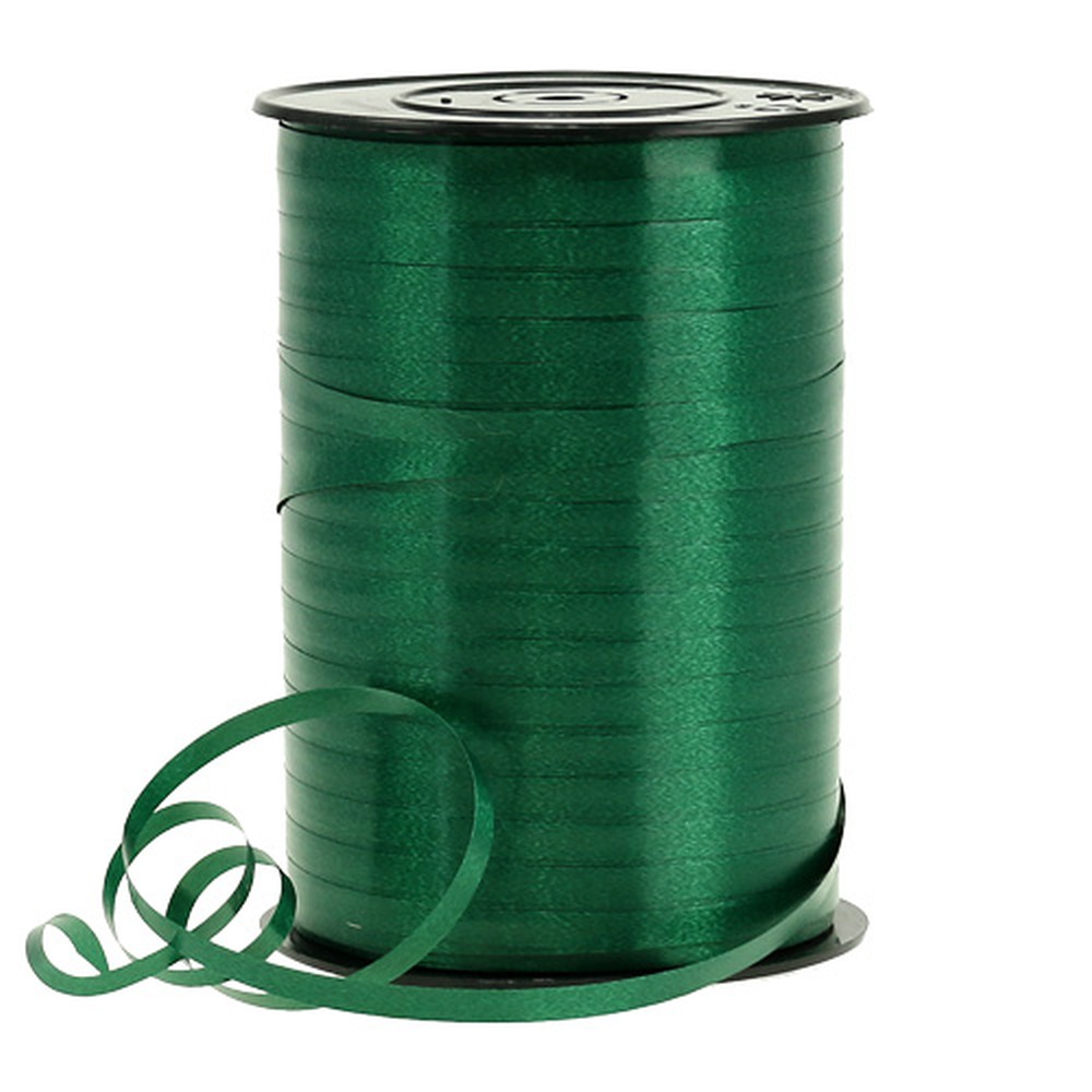 The dark green crimped ribbon, made from 100% polypropylene, is around 4.8 millimeters wide and around 500 meters long. It is rolled up on a handy plastic spool.
