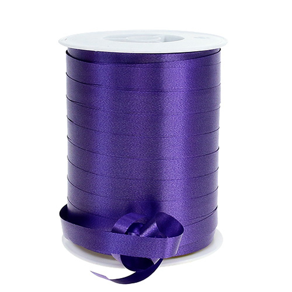 The purple curling tape made of durable plastic is on a spool that is compatible with a tape dispenser and has a total length of 250 meters. The ribbon is about 10 millimeters wide.