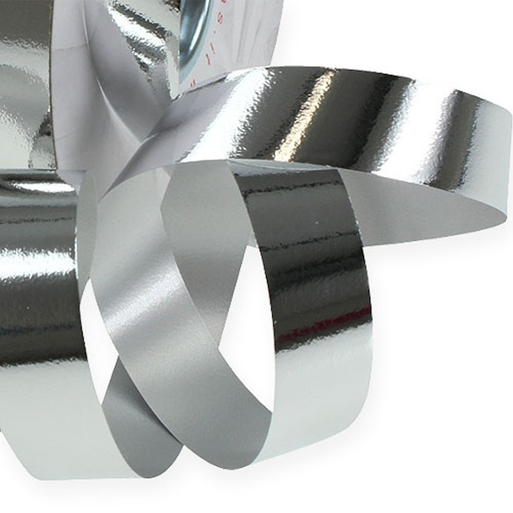 The shiny curling band in silver measures approximately 19 millimeters in width and approximately 100 meters in length. It is made of 100% polypropylene and is wound on a flat spool made of metal and cardboard.