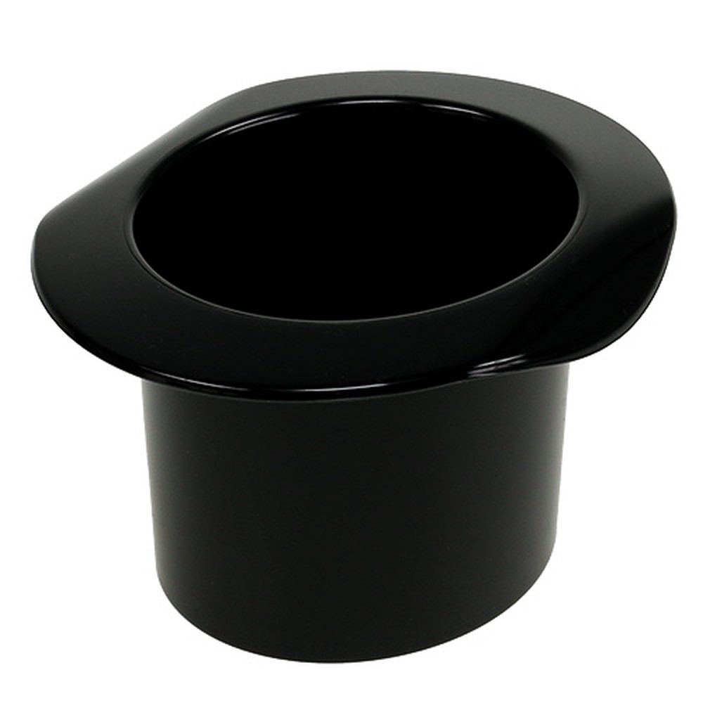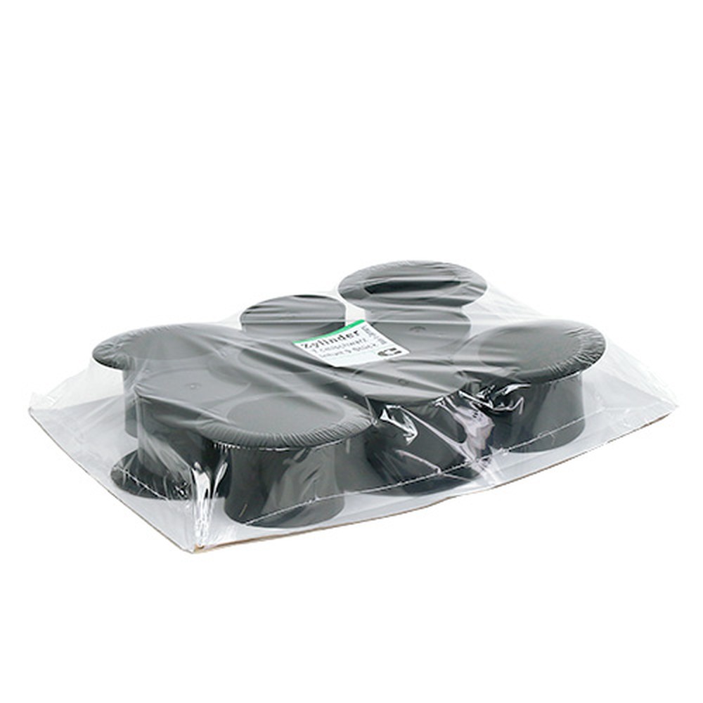 The black plastic cylinders are supplied in a set of 9 in total. Each hat is about 9 centimeters high and has a footprint of approximately 8 x 7 centimeters. The inside dimensions are around 7.5 x 6.5 centimeters, while the outside dimensions are around 12 x 10 centimeters.
