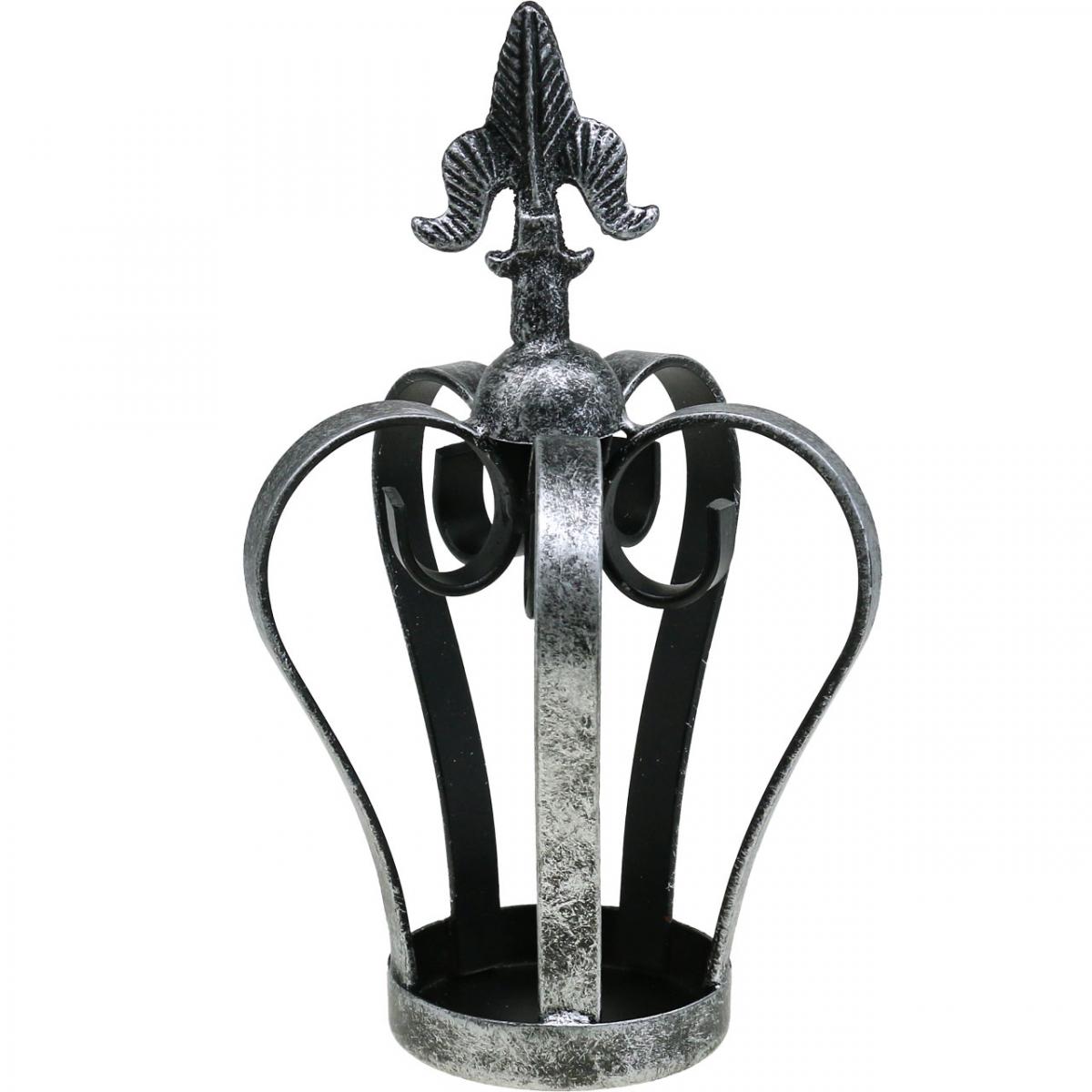 The decorative crown in antique look spreads royal flair in the table decoration and on the windowsill. The silver color of the crown looks venerably old due to black signs of wear and gives the metal decoration its unique look.Made entirely of metal, the decorative crown has sufficient dead weight to stand reliably on the table. The metal crown is completely black on the inside and also has five hooks for pendants or to attach small accessories.