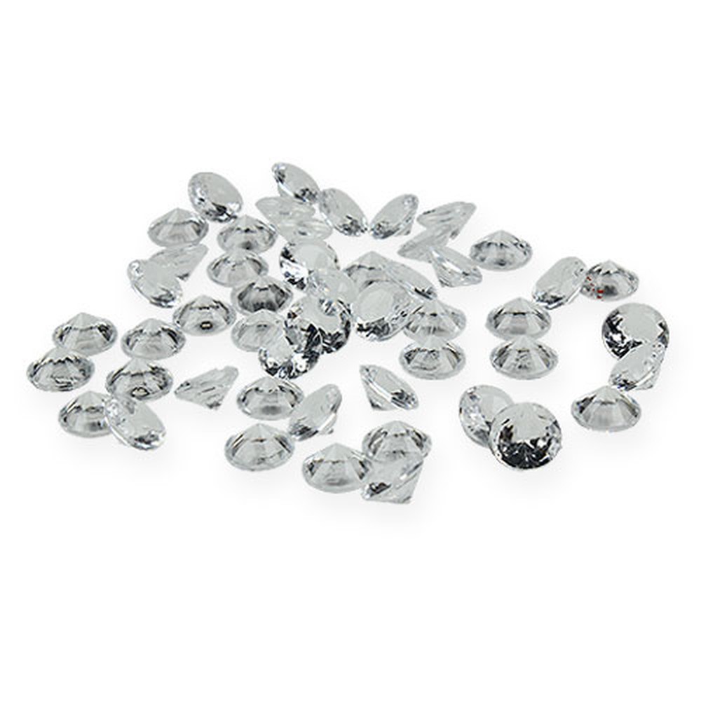 The natural look deco diamonds are in a set of 170 pieces and all have a diameter of approximately 12 millimeters. They are crystal clear, colorless, made of acrylic and, like the real models, have the typical diamond cut, which breaks up incident light so wonderfully and makes them sparkle.