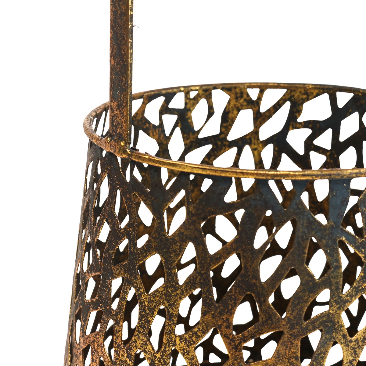 The gold-colored lantern has been elaborately provided with detailed aging effects. This results in darker accents on the shimmering, multiply perforated surface of this metal decoration. The pattern on the decorative lantern looks like a stylized network of branches or stalks. As a result, this decoration combines antique flair with timeless design.