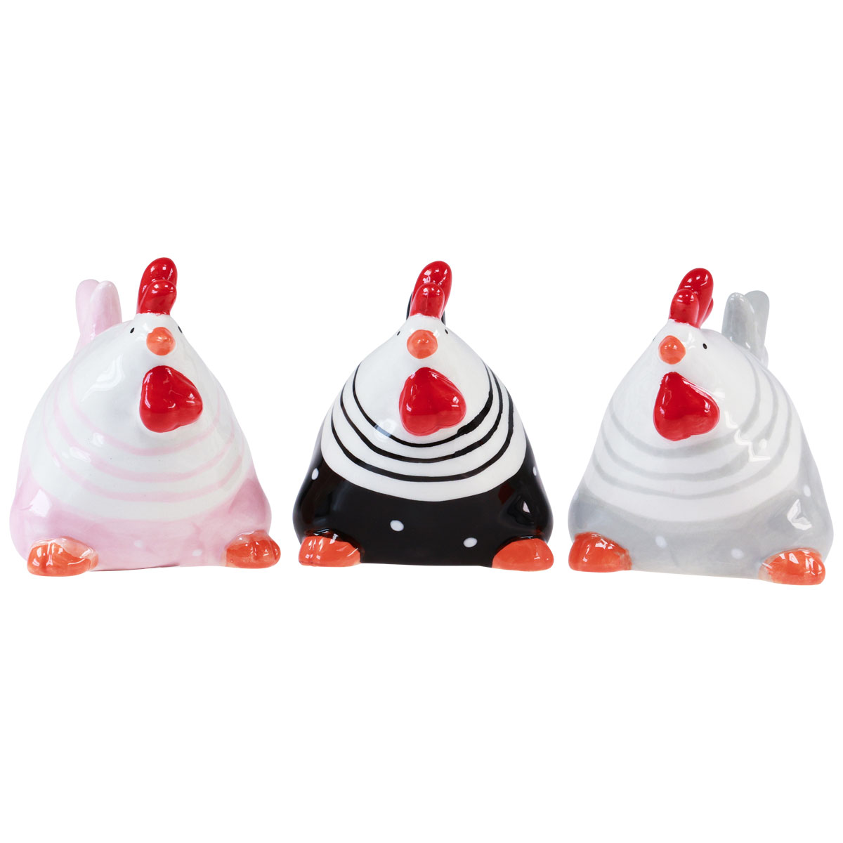 One of the decorative mother hens has a black, pink or light gray abdomen with a white dot pattern and matching colored stripes around the neck.