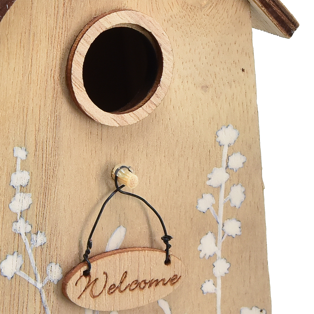 Our enchanting decorative birdhouses in white and natural wood are the perfect addition to your home, whether in the living room or on the front door. The white birdhouses impress with their detailed design and are a real eye-catcher. With a height of around 14.5 cm and equipped with a robust jute cord, the houses can be easily hung up and add charm and elegance to any room. Typical of the vintage style, the birdhouses have fine details such as an entrance hole, a lovely welcome sign and a charming print that is reminiscent of a white flower meadow. These decorative items are wonderful as a gift and present idea for any occasion, be it as an embellishment for the living room, the terrace or as part of the interior design. Let your creativity run wild and combine the decorative birdhouses with other natural accessories from the Floristik24 range.