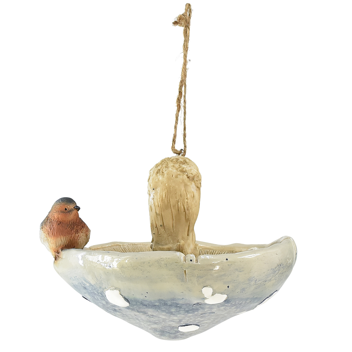 The underside of the mushroom, i.e. the mushroom cap, is glazed blue and white like a ceramic decoration to resemble a fly agaric. The gills and stem, on the other hand, are a detailed replica of a real forest mushroom. The little robin on the edge makes the hanging decoration a romantic eye-catcher.
