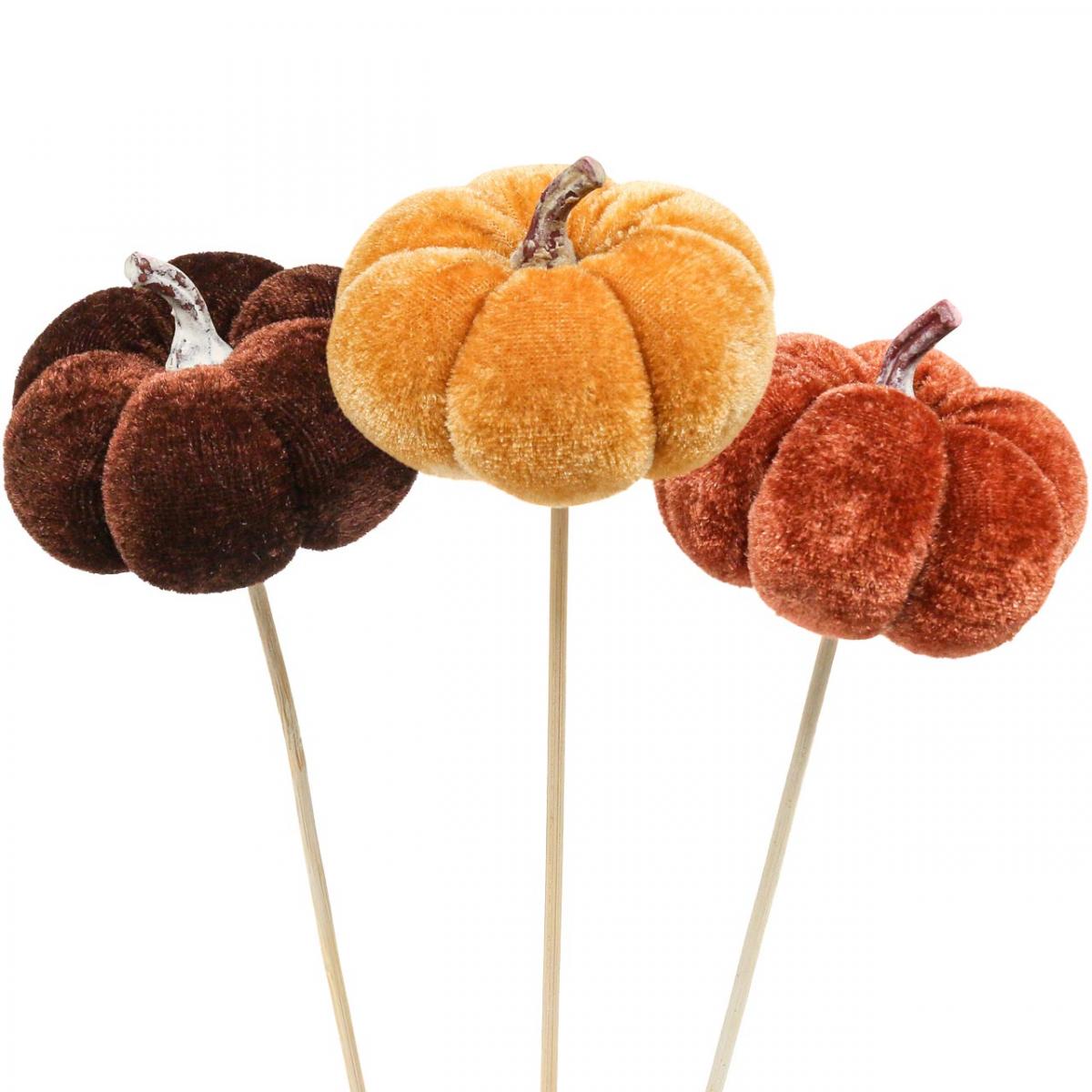 The pumpkin decoration made of a soft body with a velvety coating is available in three sorts. The handle on the pumpkin, which also serves as a holder for the plug, is made of plastic. You will receive three decorative pumpkins in orange, three in light brown and three in dark brown.