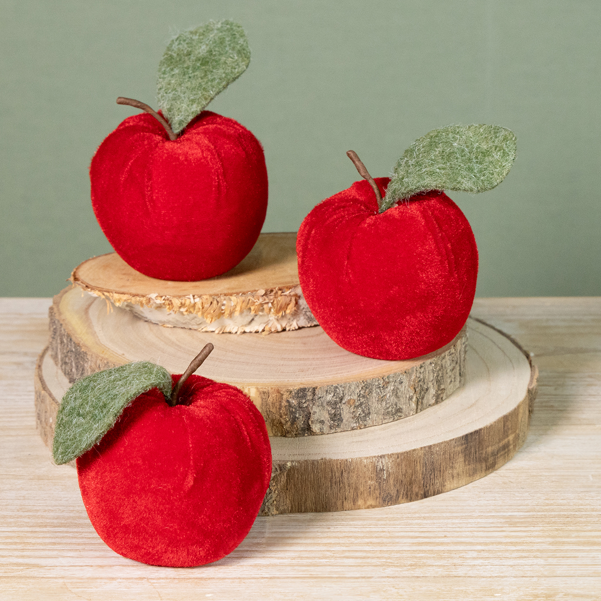This decorative fabric apple with leaf is the perfect addition to your autumnal table setting or atmospheric windowsill arrangement. With a diameter of approximately 7.5 cm and a height of approximately 9 cm, these apple creations made of velvety shimmering fabric, complemented by a green felt leaf and a small brown stem, add a natural touch to any decor. The combination of soft velvet fabric and green felt gives the decorative apple not only an elegant appearance but also a pleasant feel. This artificial apple is ideal for creative window displays or as a charming addition to your seasonal home accessories in a cozy country-house style.