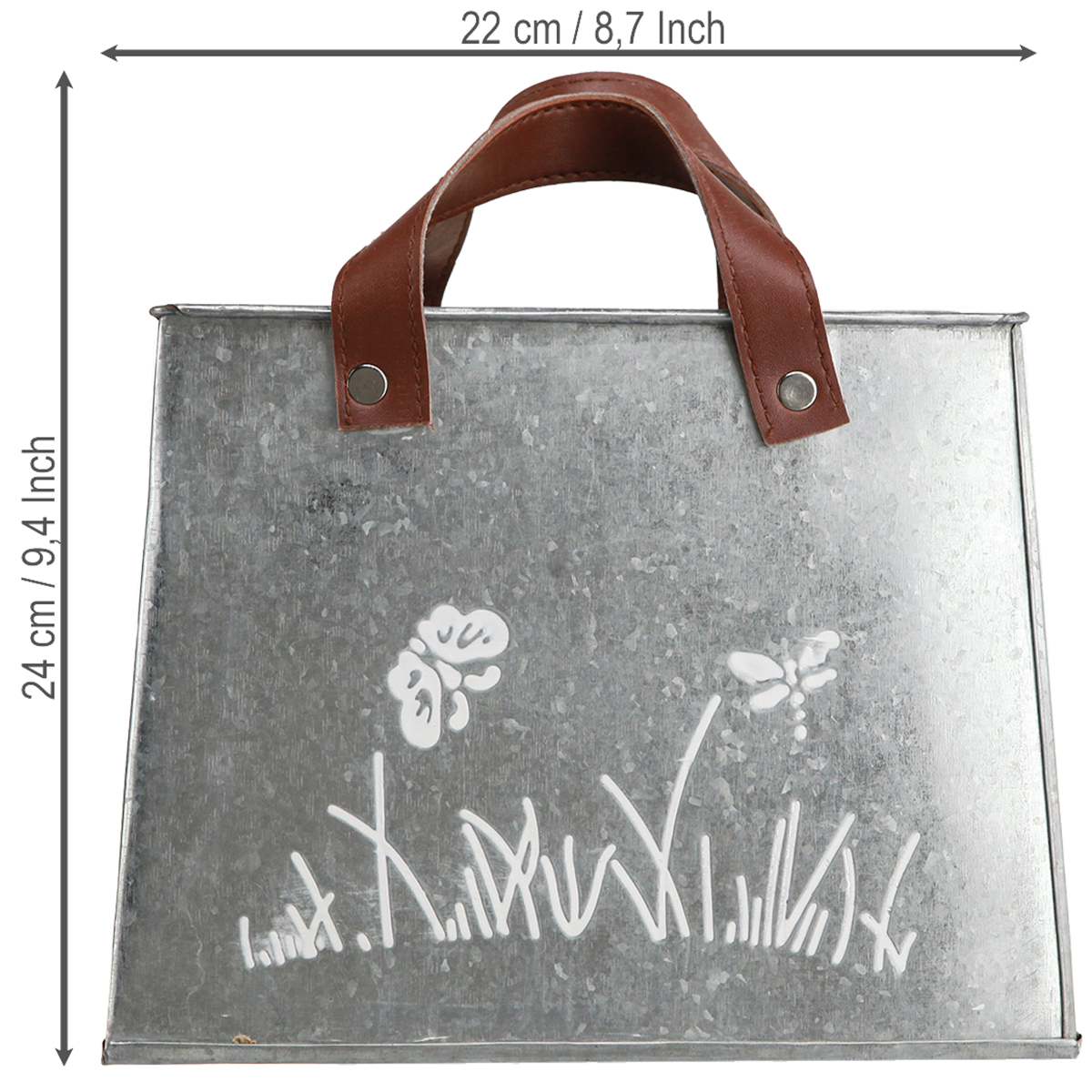 Our silver-colored decorative metal bags combine functionality and design in an extraordinary way. These planters are ideal for decorators, creative minds and all those who want to add a touch of elegance to their home. With a white motif of butterflies and grasses on both sides and the brown faux leather handles, you get a product that is suitable both as a plant pot and as a decorative element for the balcony or table. This decorative plant bag highlights the rustic charm and goes wonderfully with other vintage decorations. Give your home a personal touch with these extraordinary metal plant pots, which impress with their simple, timeless elegance.