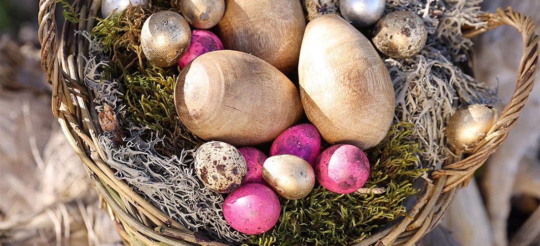 Decorative birds & butterflies or figurines such as bunnies, chicks, ducks and chickens with multicolored Easter eggs, flower pots and numerous variations of baskets and bowls –