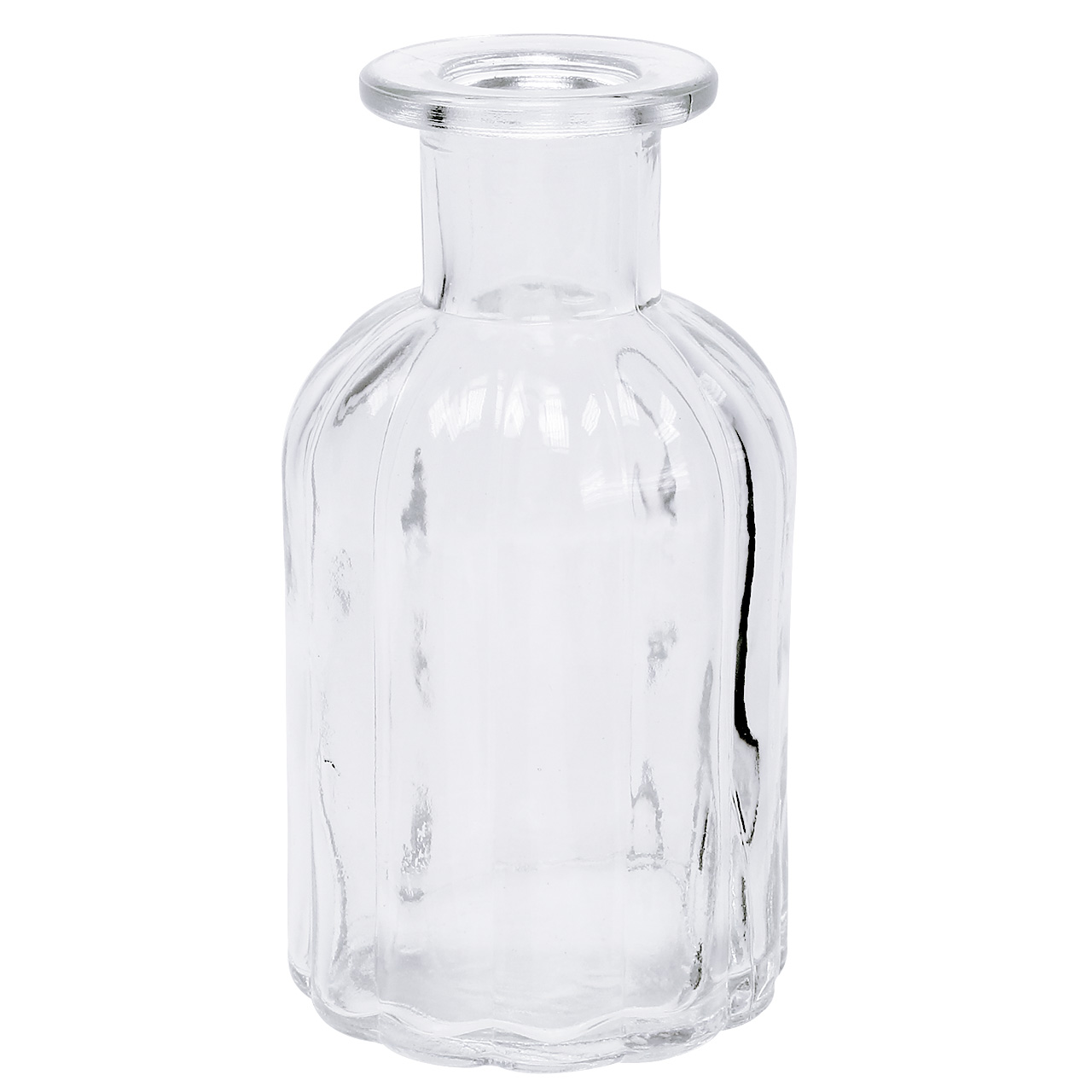 Be it as part of an original gift idea, as a sweet flower vase or as an eye-catcher in a somewhat larger decoration project: This decoration bottle made of clear glass can be used to realize a wide variety of creative ideas! The wide rim at the opening and the glass body with vertical grooves arouse associations with vintage medicine bottles or older perfume bottles, so that you can give away, for example, perfumes, oils or self-made liqueurs in the glass bottle.For this and other purposes it is a good idea to decorate the bottle with bows made of fine lace or organza ribbon. This also applies if you want to use the vessel supplied in a set of 6 as a decorative, small vase: Place one or more of the glass vases on different sized birch or alder discs and then add either fresh or lifelike-looking artificial flowers. Especially in the latter case, giveaways such as decorative pearls can be distributed on the bottom of the bottle - a particularly nice idea if you want to create a chic wedding table decoration!
