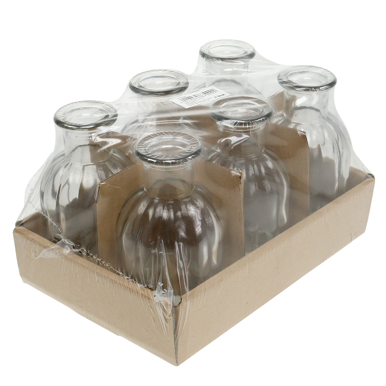 Each of the 6 clear glass decorative bottles that can be used as flower vases measures around 13.5 centimeters in height and around 7.5 centimeters in diameter. The opening diameter is approximately 2.7 centimeters. You will receive the set in cardboard and plastic packaging.