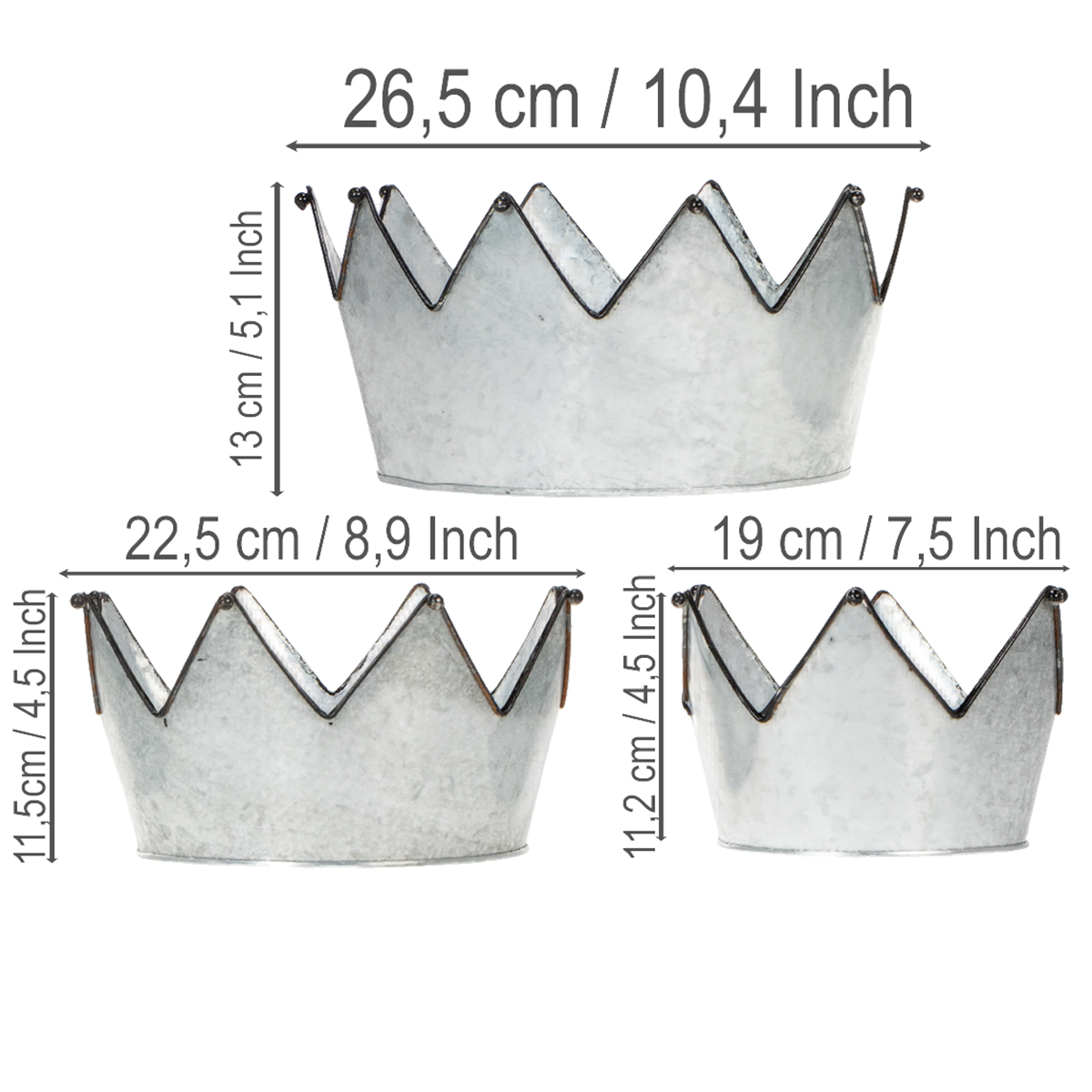 The three metal bowls made of zinc are made in different sizes. What they have in common is the black border around the spikes, which are decorated with a small ornamental ball. The ball is also black to match the vintage decoration. The black border with decoration makes it clear to everyone: There are three crowns here - ready to be filled or simply to be placed.
