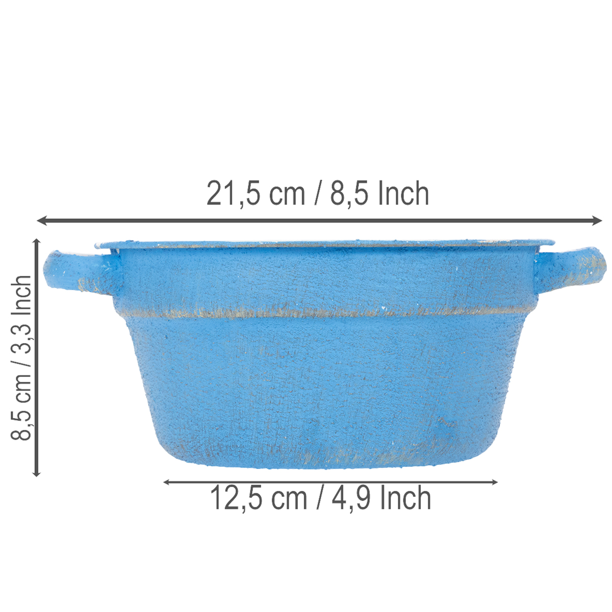The decorative bowl is made of thin metal and is therefore very light. Inside the decorative pot is white, outside the metal decoration shines in the most beautiful sky blue. Due to the roughened surface and gray accents, the planter looks authentically old. A bead and two small handles allow the decorative bowl to be wired or decorated with jute ribbon if required.