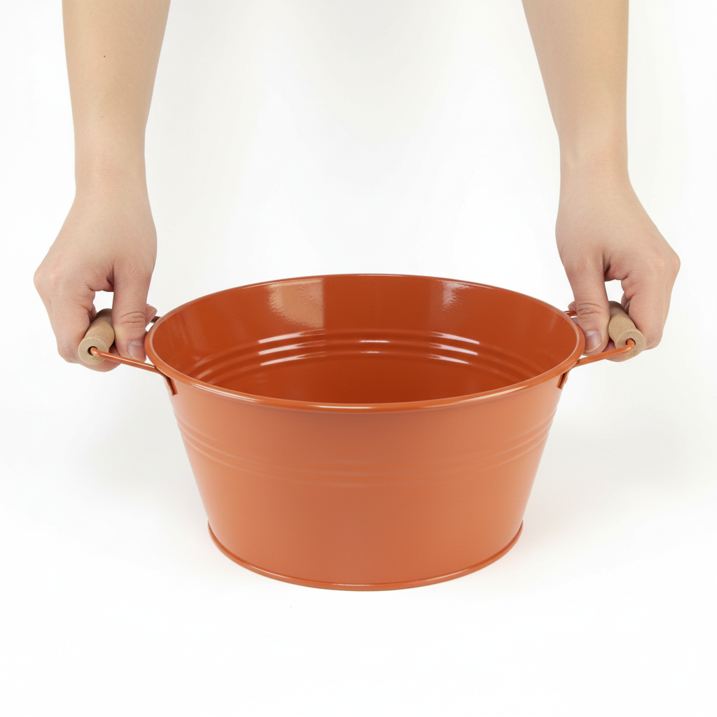 Painted warm and earth-colored, the decorative bowl shines even more beautifully with green plants. The handles with turned handles made of untreated wood are particularly beautiful. The metal bowl looks just like a bowl that was previously used in the home and in agriculture.