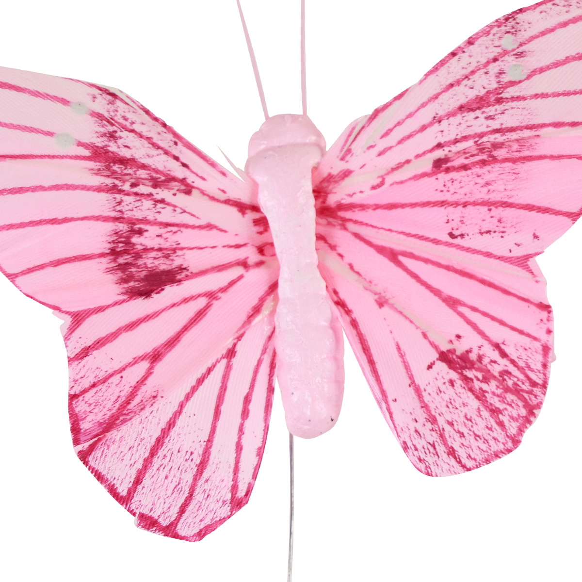 The decorative butterflies are made from real feathers, which are colored and attached to a polystyrene body. A long silver metal wire is attached to the underside of the decorative butterfly, which makes the butterfly decoration a versatile flower stud. – This allows the decorative butterflies made of feathers to be tied in, plugged in or wired.