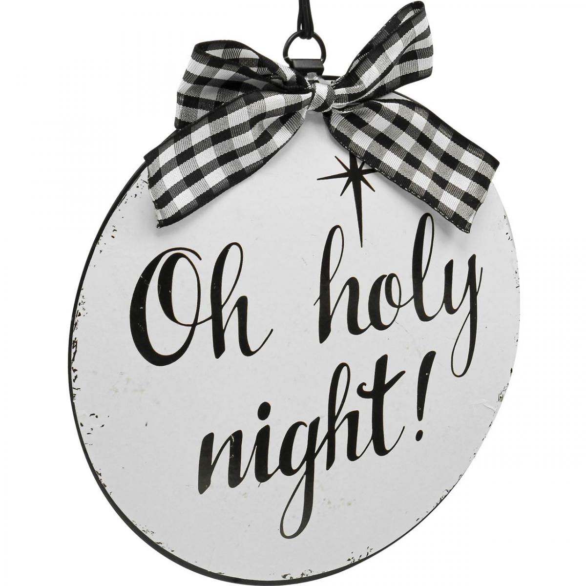 The background of the metal surfaces is white, while the lettering, the edge and small snowflakes on the Christmas tree decorations are black. Each metal pendant also has an adorable black and white checkered bow. Irregular color speckles towards the edge give the festive metal decoration an appealing vintage look.