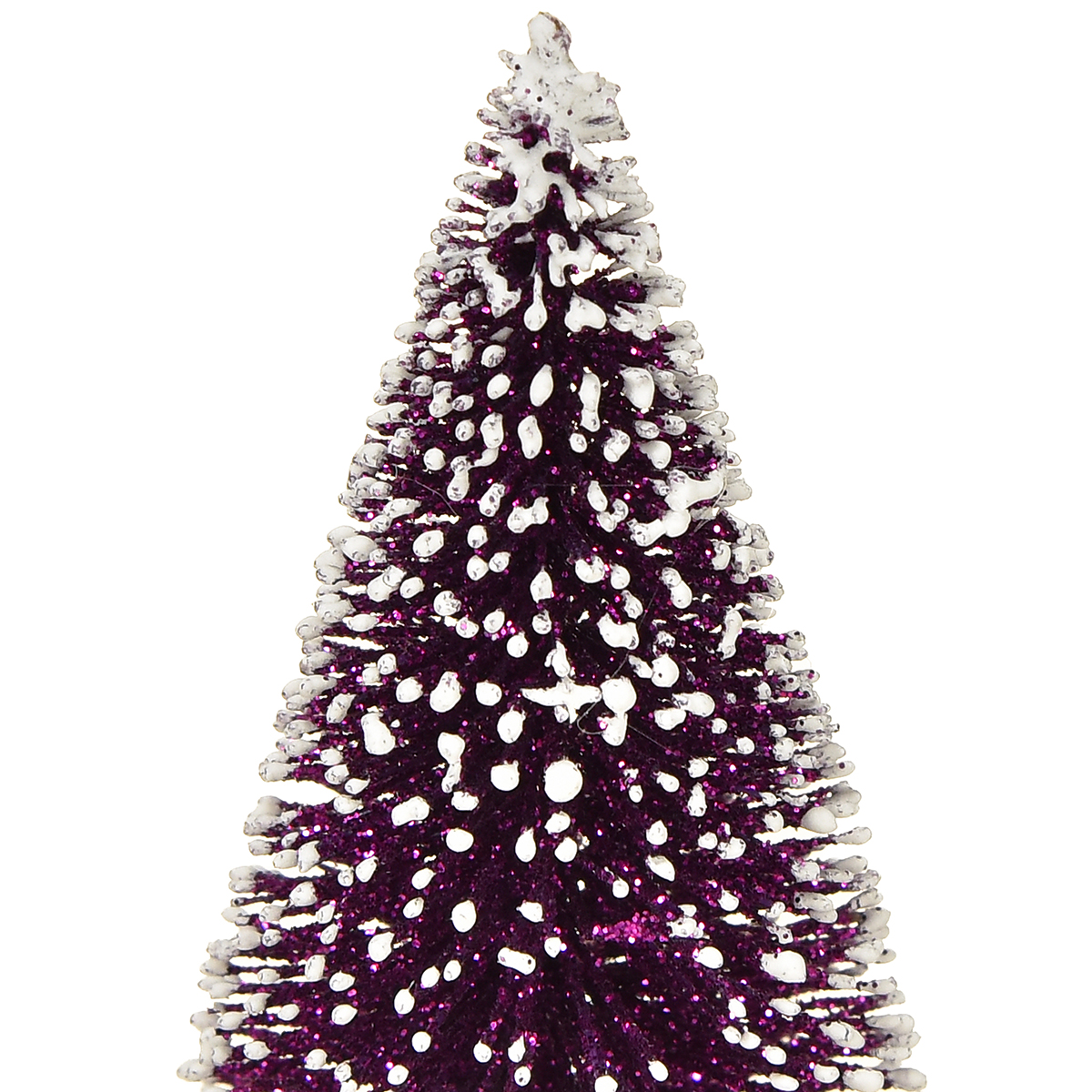 Decorative Christmas tree in purple with snow tip on a rustic wooden base 15cm 3 pieces.