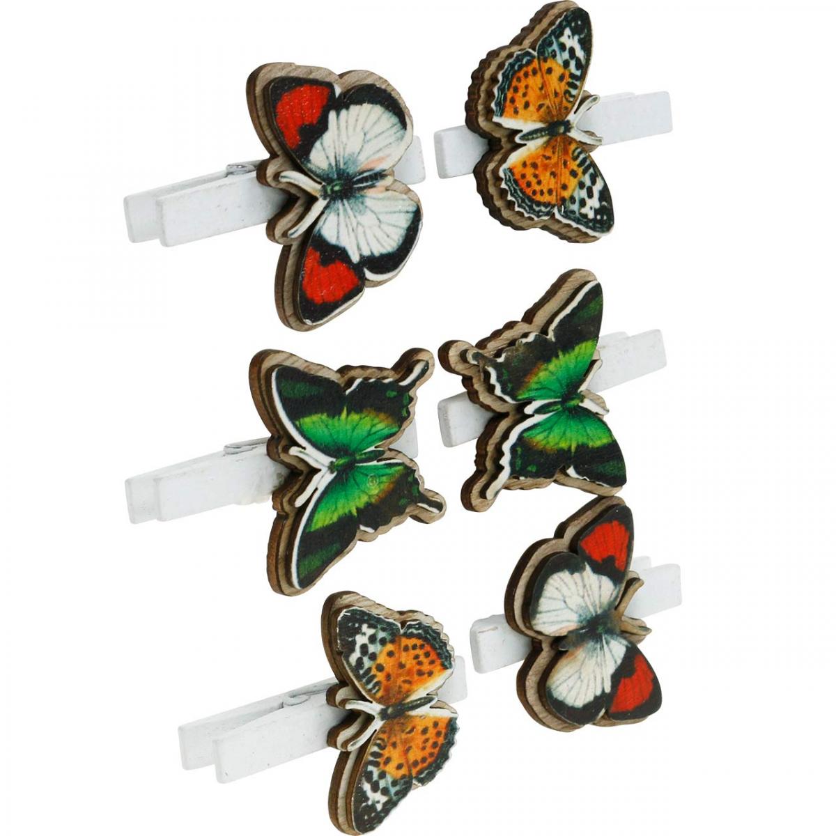 The wooden butterflies are provided with a small wooden clip in white on the back, with which the wooden insects can be conveniently clamped anywhere. Three different types of butterflies are printed on the decorative clip in a realistic photo print. The butterflies resemble the aurora butterfly, the big fox, and the neon swallowtail.