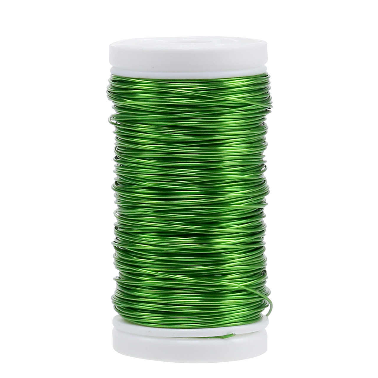 The apple-green decorative enameled wire is around 50 meters long, measures around 0.50 millimeters in diameter and, together with the plastic spool on which it is wound, weighs around 100 grams. The spool can be hung up to make it easier to unwind the wire .