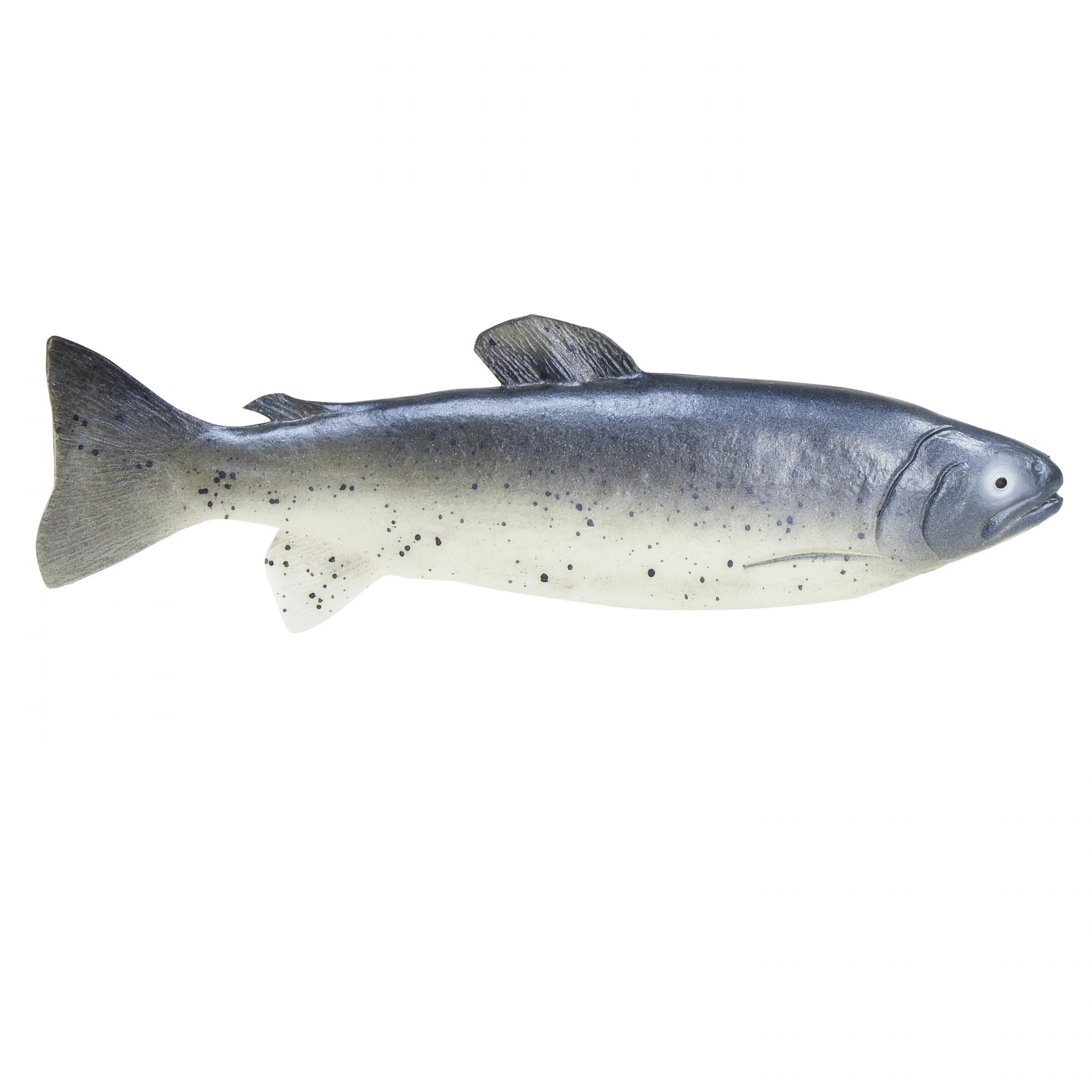 The decorative fish is made of plastic and designed like a trout. While the belly is white, the patterned body turns into an increasingly darker silver-gray towards the top.