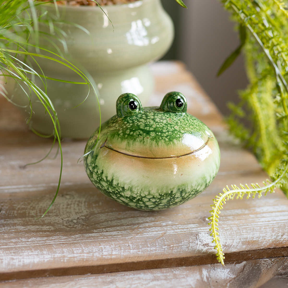 Thanks to their charming design and vibrant green color, these garden figurines radiate freshness and joie de vivre. The handcrafted ceramic not only ensures durability but also gives the frogs a smooth, velvety sheen. They fit perfectly into almost any setting – from modern minimalism and rustic country style to playful urban jungle. These frogs are meant to be seen: on the garden table, among plants, or as eye-catching accents on the windowsill. A small decorative touch that makes a big impact!