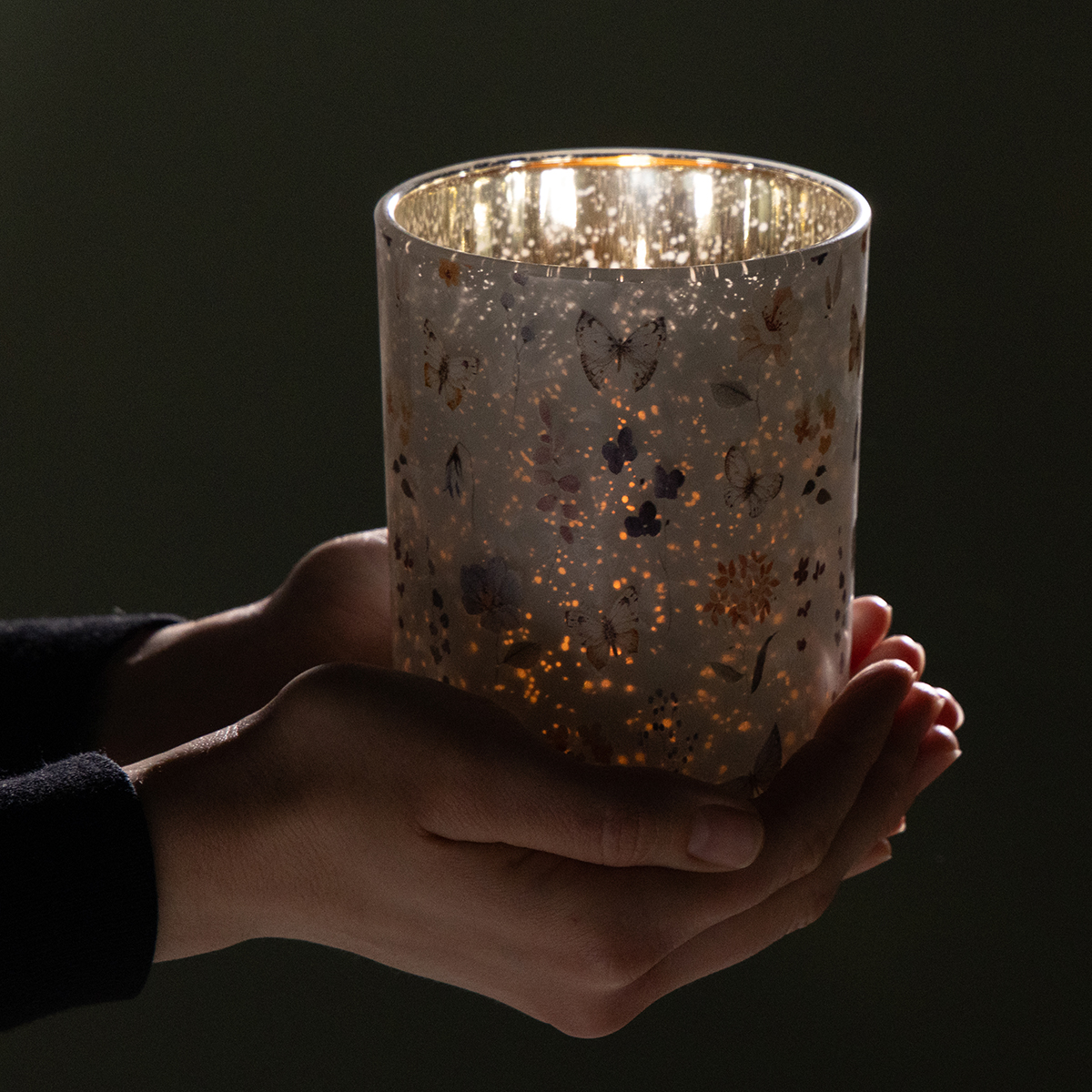 This candle holder is a real eye-catcher. At 8 cm high and 7 cm in diameter, it's just the right size to diffuse a soft light without being overpowering. The delicate butterfly motif on the glass, combined with the internal silver reflective surface, creates a magical interplay of light and shadow when a candle is lit inside. It adds a touch of elegance to both indoor and outdoor spaces.