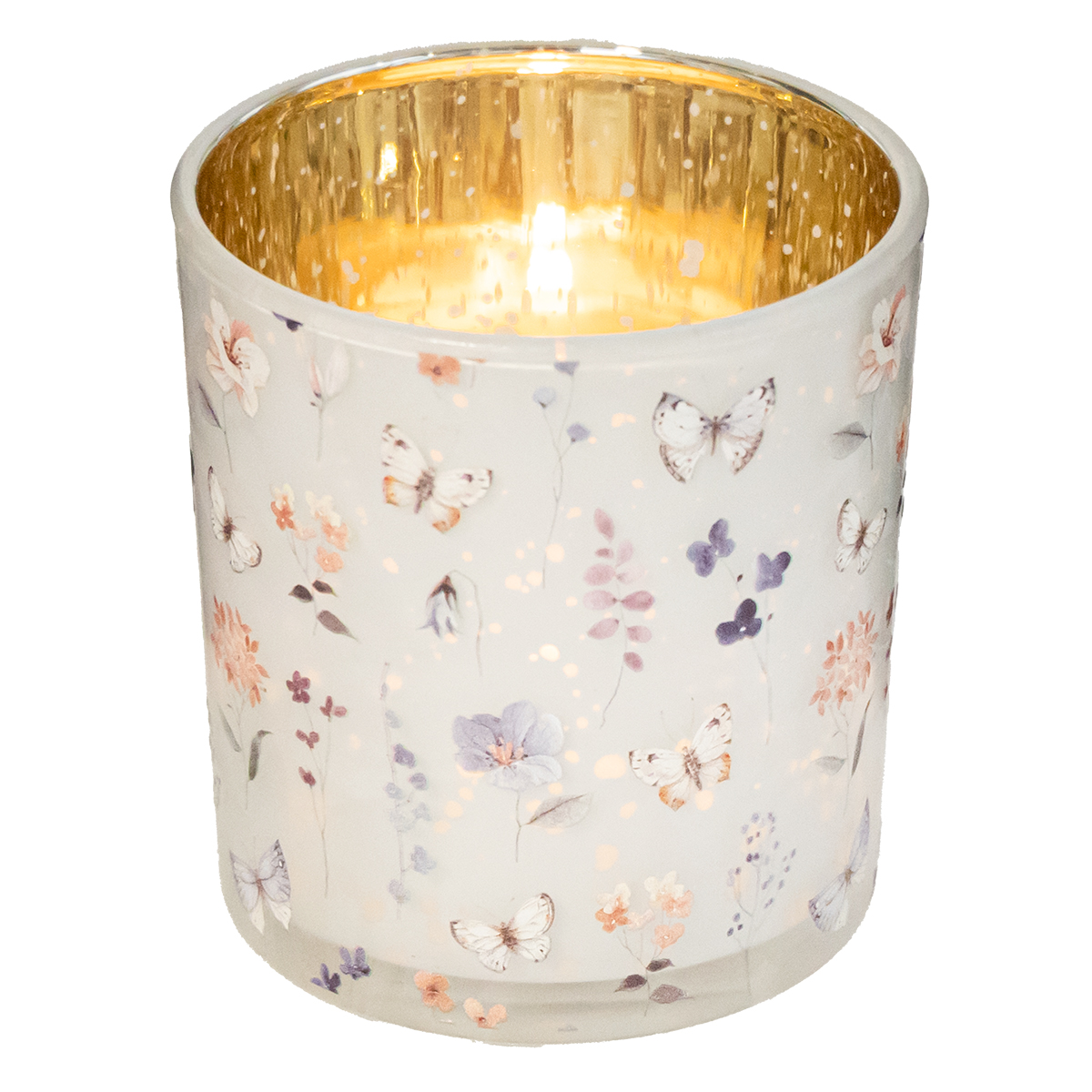 This candle holder is a real eye-catcher. At 8 cm high and 7 cm in diameter, it's just the right size to diffuse a soft light without being overpowering. The delicate butterfly motif on the glass, combined with the internal silver reflective surface, creates a magical interplay of light and shadow when a candle is lit inside. It adds a touch of elegance to both indoor and outdoor spaces.