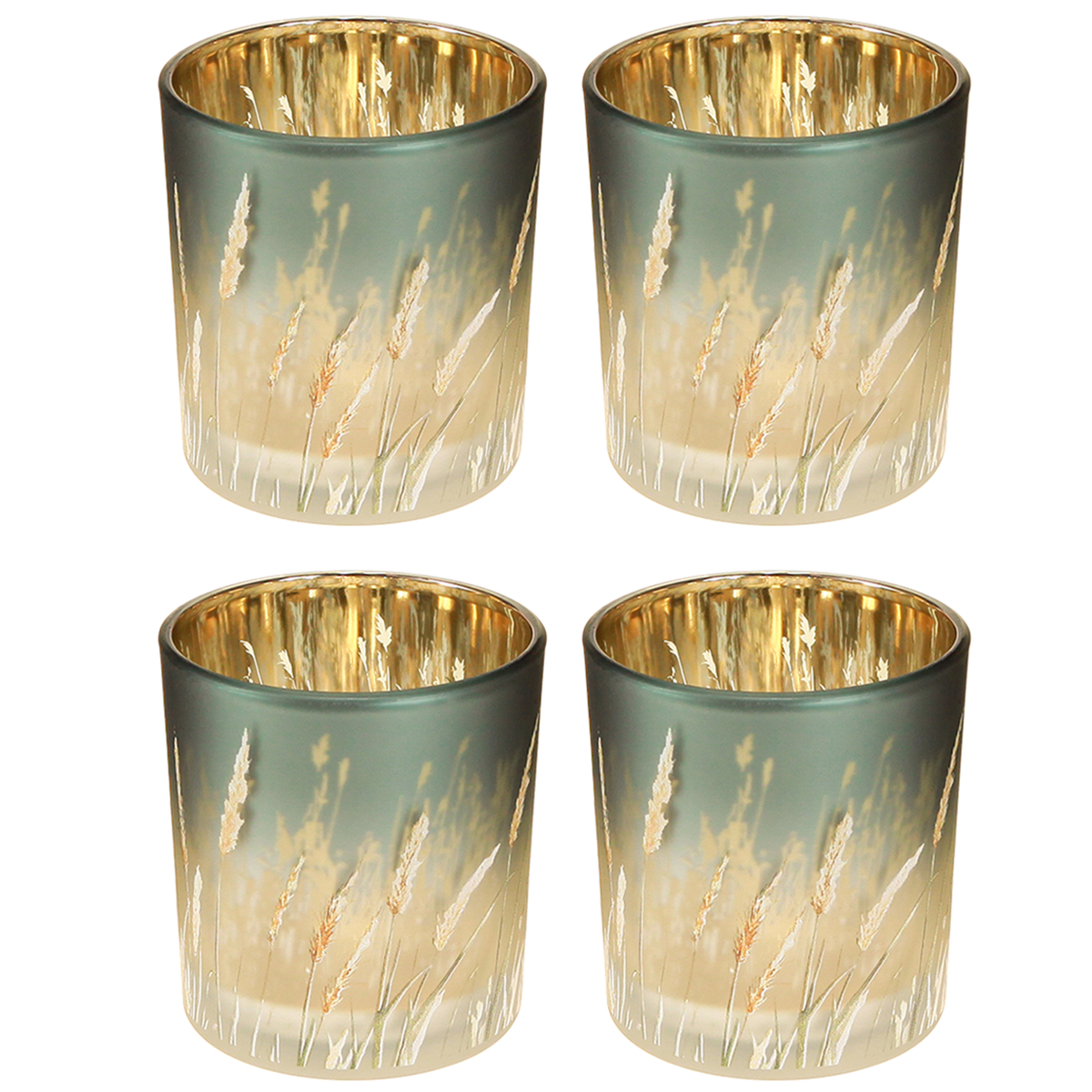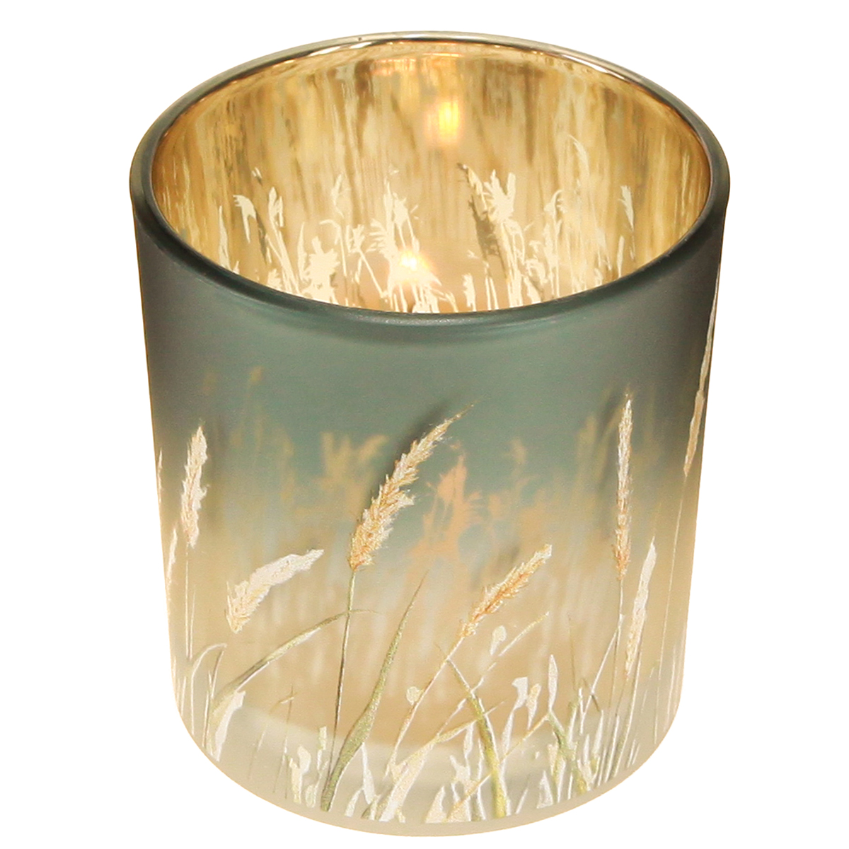 Looking for a stylish accent for your home? How about a decorative piece that exudes harmony while creating beautiful light effects? This glass lantern with its grass design is a real eye-catcher – subtly crafted in blue and gold, with a delicate pattern reminiscent of grasses swaying gently in a summer breeze. Imagine: the warm glow of a tealight inside reflects the intricate design, creating a cozy atmosphere. Whether used as an elegant table decoration for an evening dinner, as soft lighting on the windowsill, or as comfortable illumination on the patio – these glass lanterns add a special touch to any room. Perfect for those who want to combine romance with natural style.