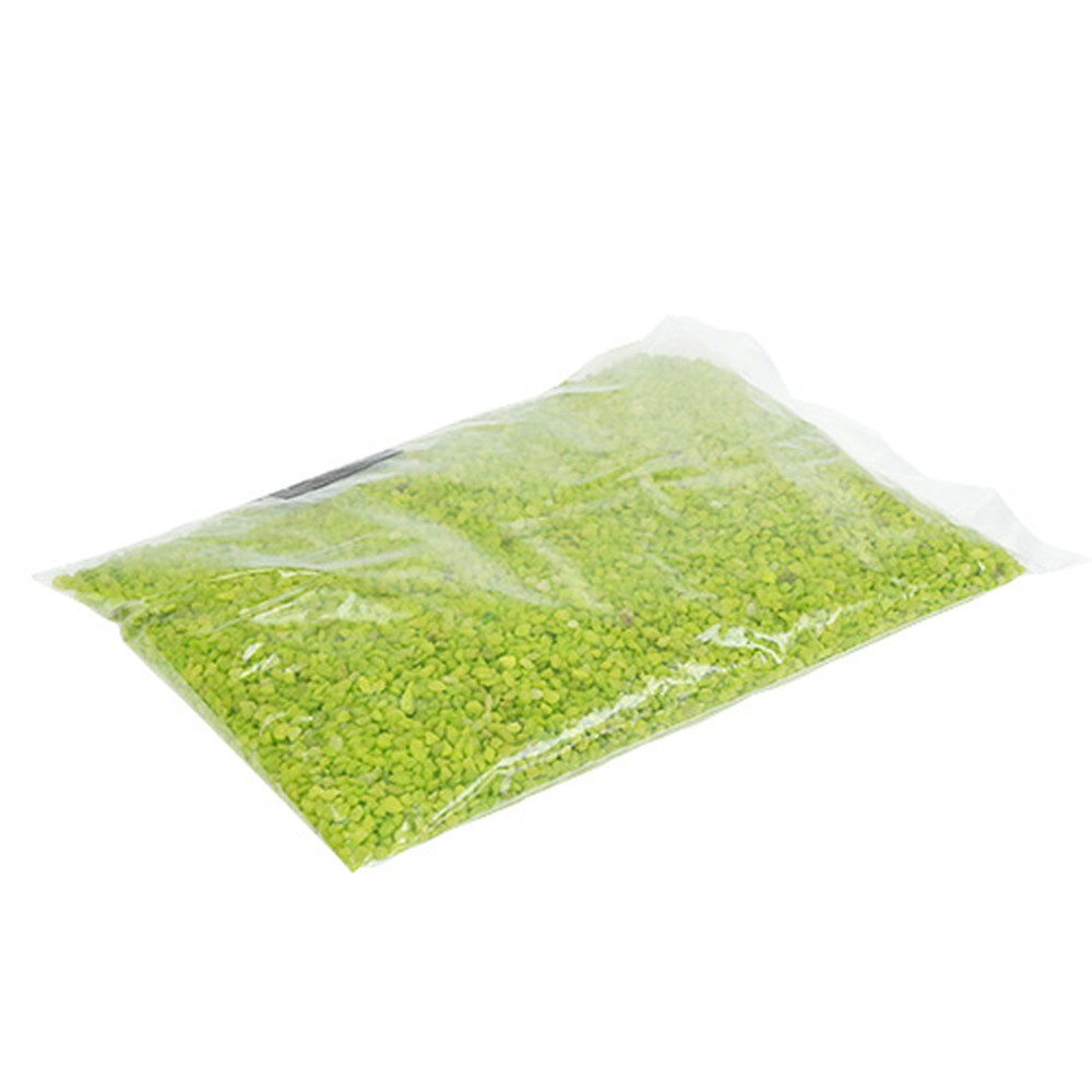 The bag contains a total of around 2 kilograms of apple-green colored decorative marble granules, which are made up of numerous small natural pebbles. These are each approximately between 2 and 3 millimeters in size.