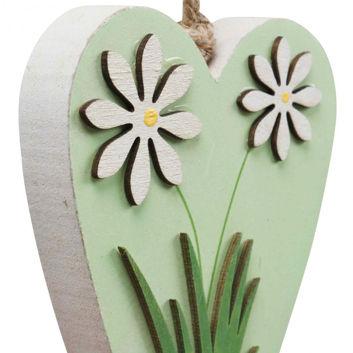 Decorative hearts for hanging with flowers wood green, white 8.5×12cm 4 pcs