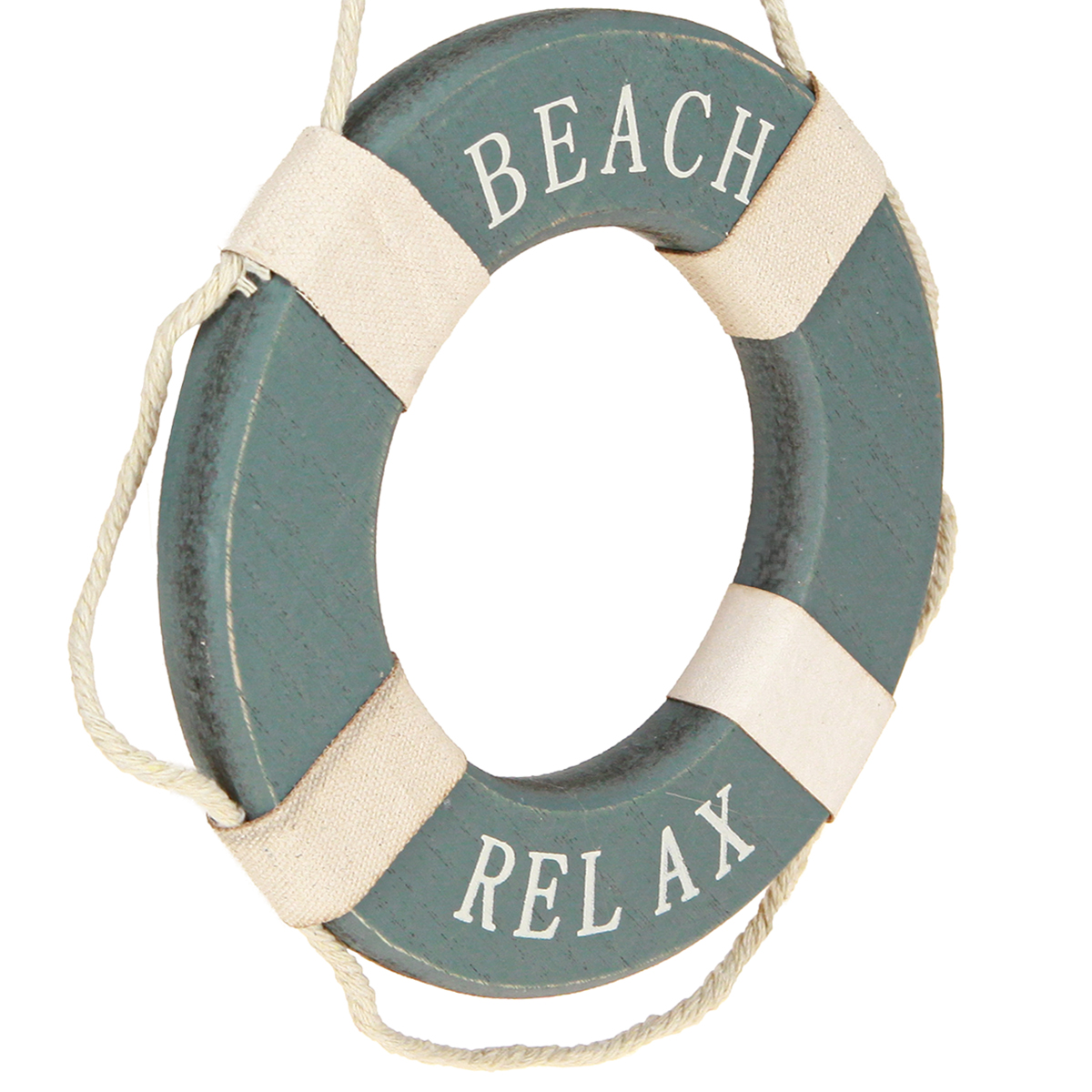 The small swimming ring is divided into three sections in its typical look, one of which is light blue and the other dark blue. The white areas of the life ring have “Relax” and “Beach” written on them. The decorative life rings are divided with cotton ribbon. A longer cotton ribbon that runs around the swimming ring forms a loop on the top of the decorative ring for hanging.