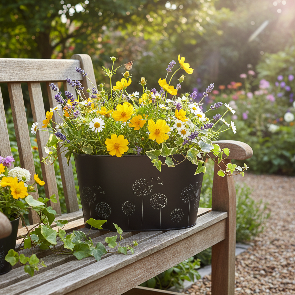 You can also find the stylish pattern with dandelions on other metal planters and decorative containers.