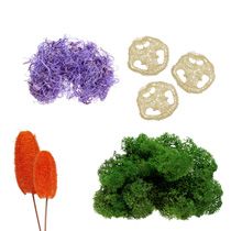Materials: Natural materials (e.g. moss, twigs, bark, cones), plastic (e.g. PE, PVC), textiles, metal, ceramics and glass.