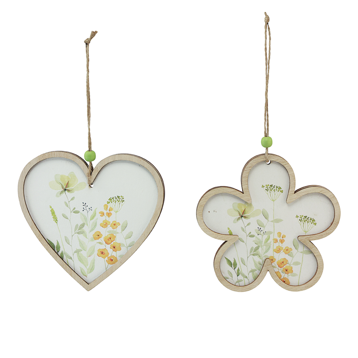 Three pendants each have the shape of hearts and flowers. The vintage decoration is made of wood and has a jute cord with a green wooden bead. The delicate flower pattern is lovingly designed and brings back memories of colorful flower meadows. The wooden edge is 5 mm high and sets very special accents.