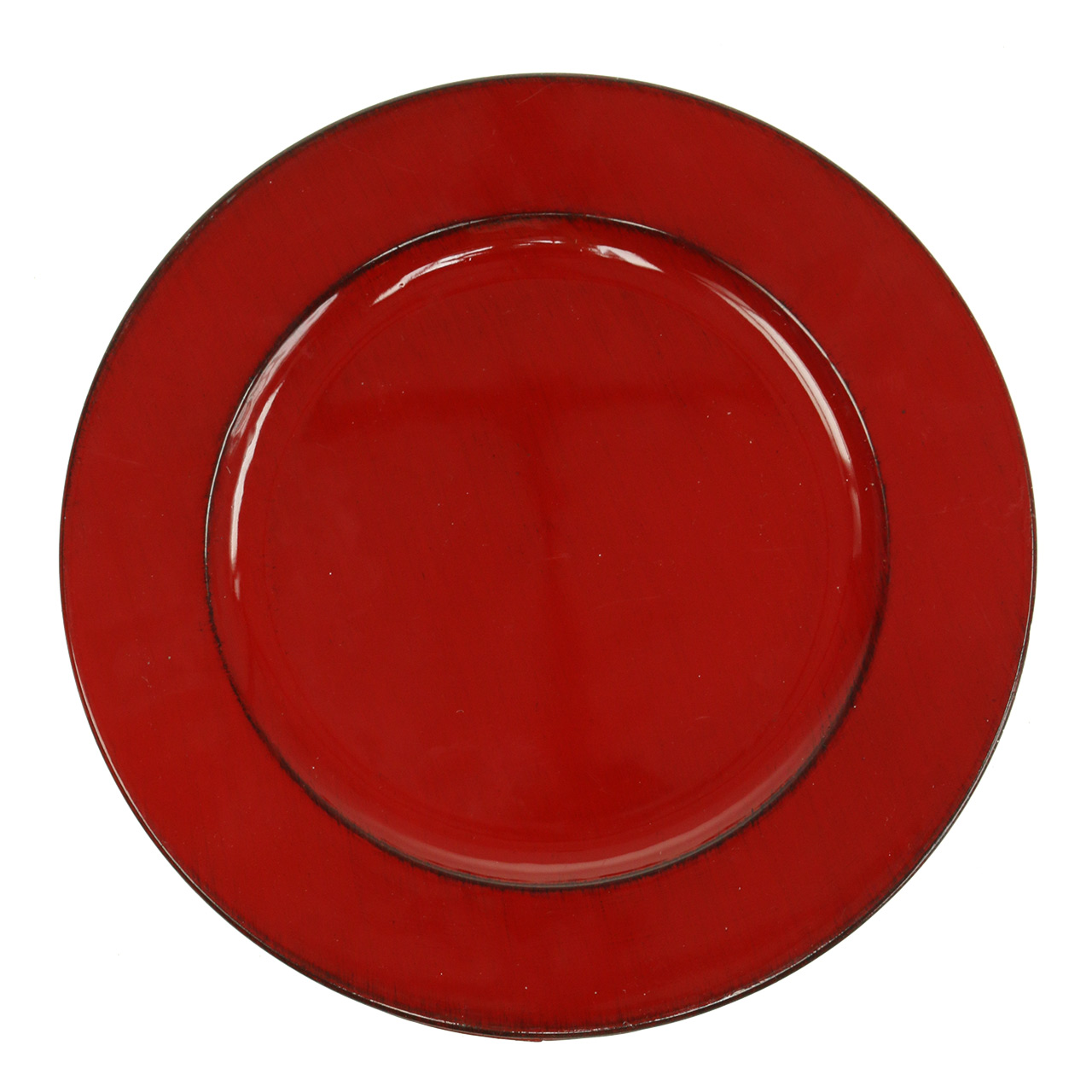 The decorative plate in red and black has an outer diameter of around 22 centimeters, while the footprint is around 14 centimeters.