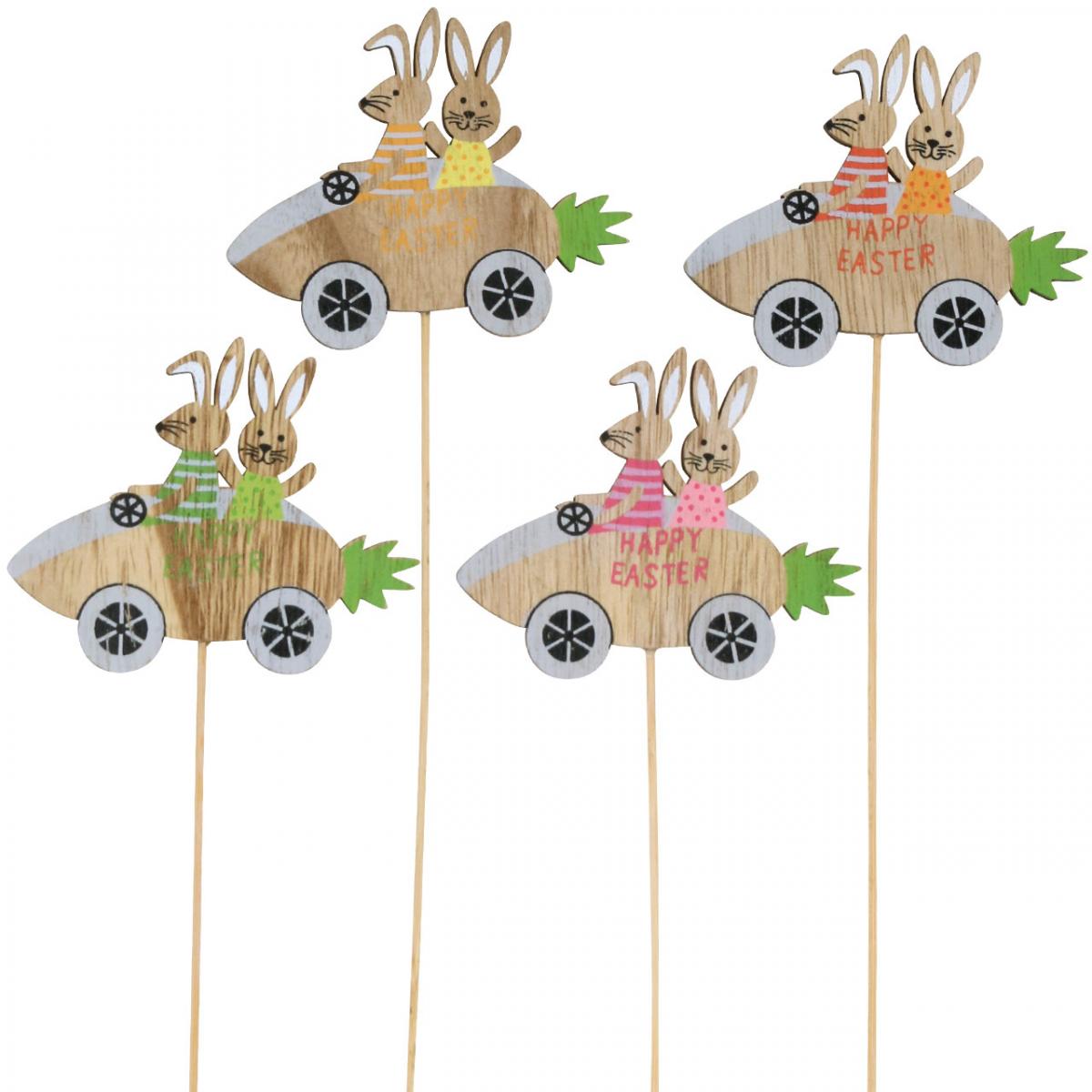 You get a total of 16 four-colored assorted decorative plugs with the bunnies in the car, i.e. four Easter bunnies on the stick of each color variant.