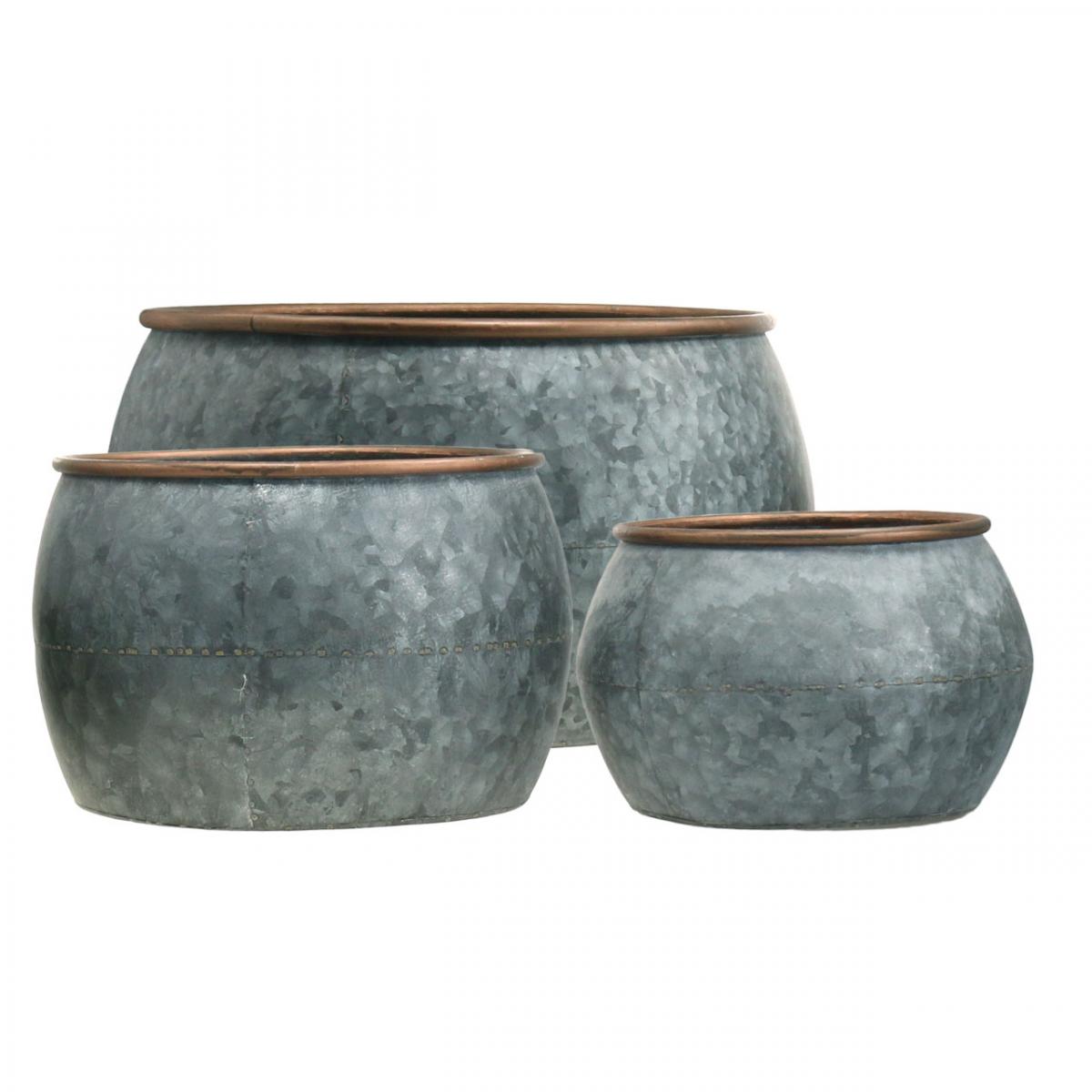 This bulbous decorative pot in three sizes is a wonderful plant bowl with an antique look! The graceful metal vessels in elegant silver gray and elements in a trendy copper tone come in a practical set of 3.